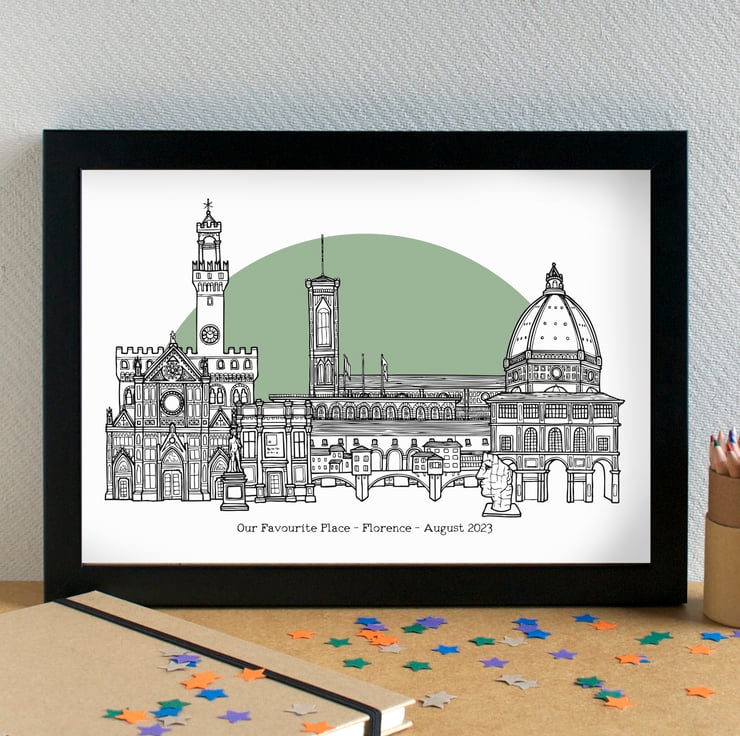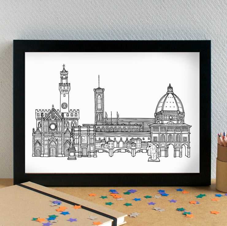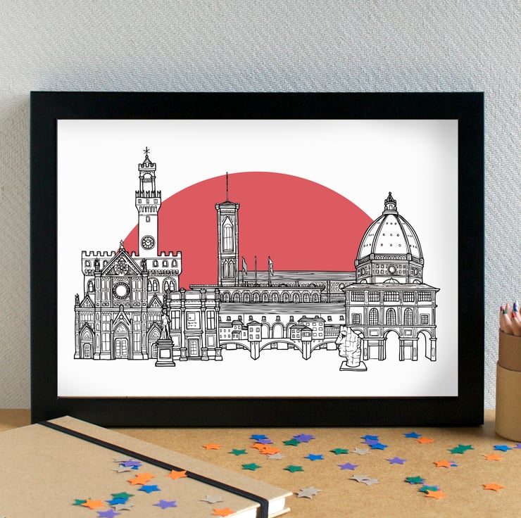 A stunning, detailed print of my hand drawn skyline illustration of the most famous landmarks in Florence.