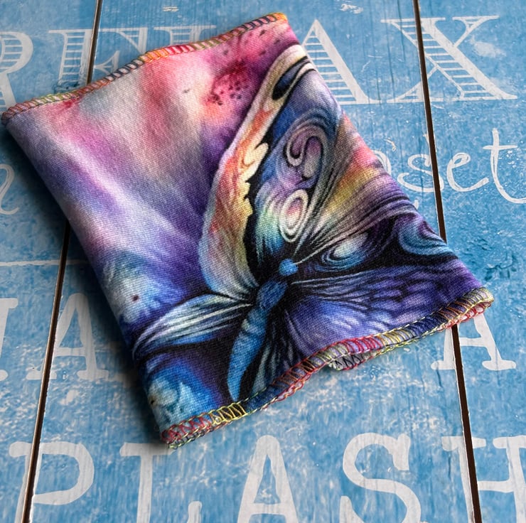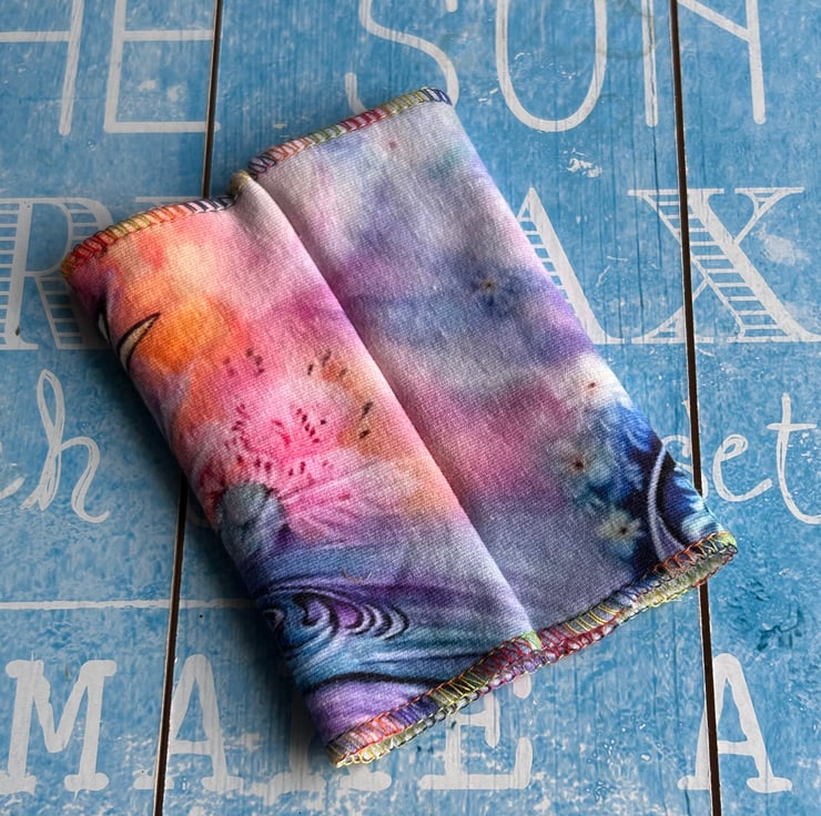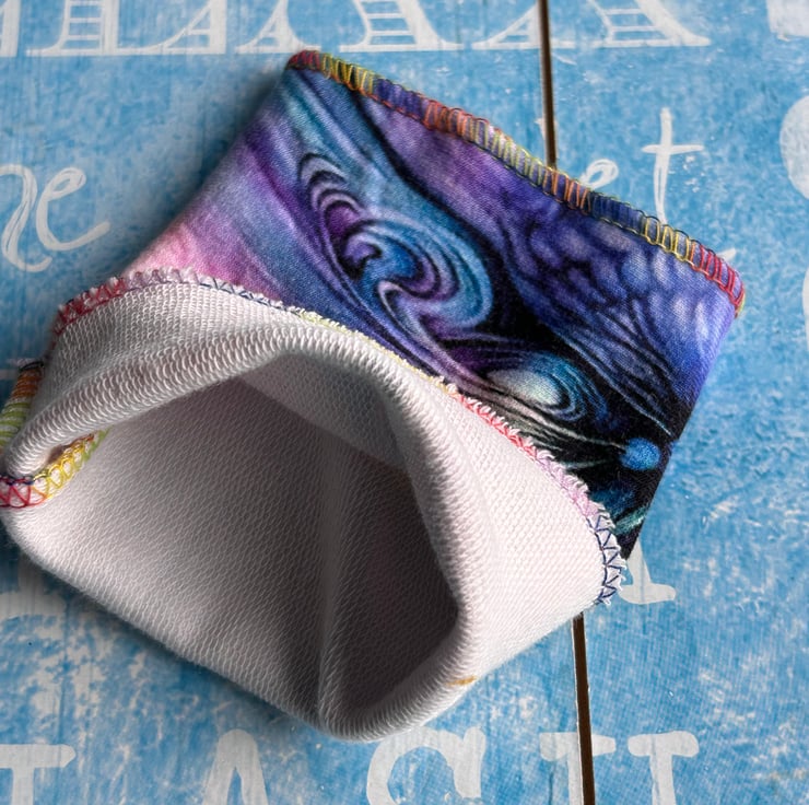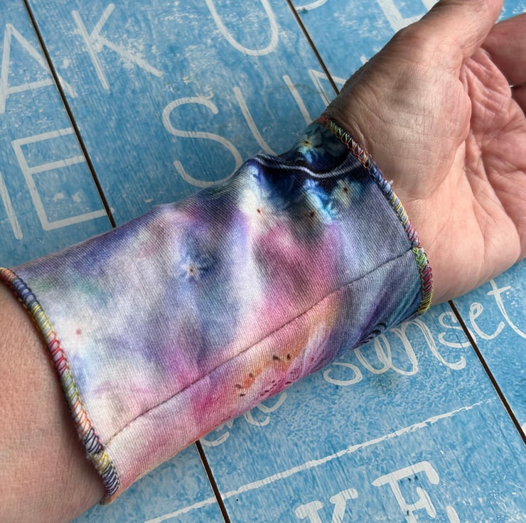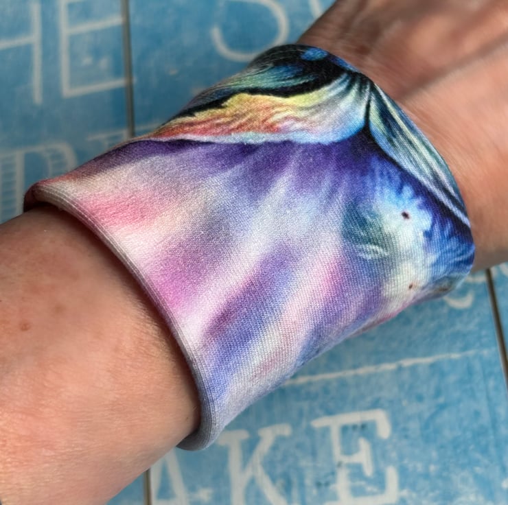 This pretty slip on bracelet is created using unwanted fabric. This colourful French Terry has turned into an easy to wear wrist cover. I have overlocked the hem. Creating a colourful finish. A simple use of the fabric.