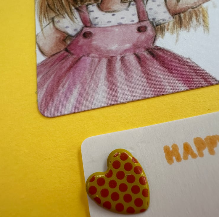 This card includes a metal heart secured by pin tags on the reverse. These are covered by a coordinating heart sticker but care must be taken with very young children. It may be easily removed if required.
