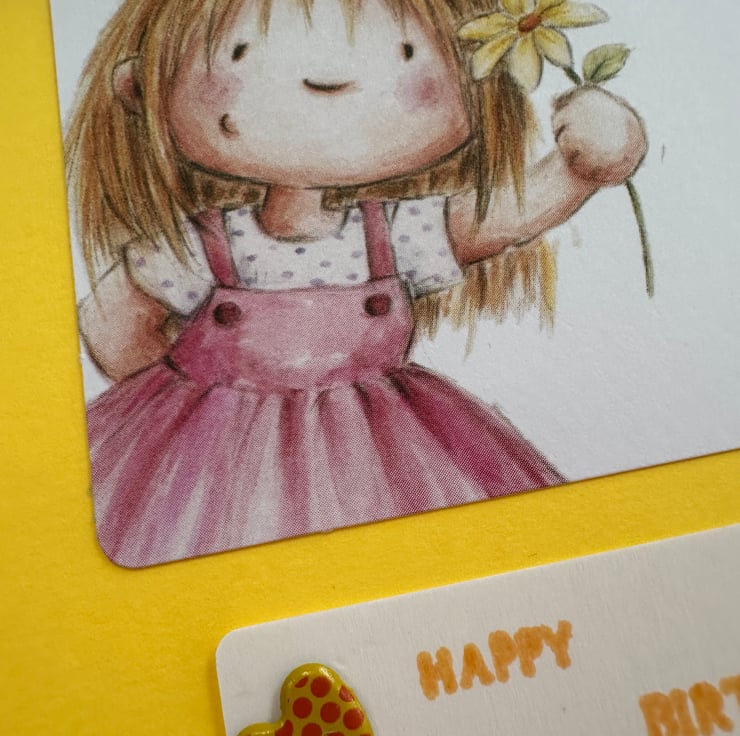 On heavy bright yellow card stock, with a white card stock image of a cute little girl peeping out with a butterfly on her head, holding out a flower A separate tag below has the message “Happy Birthday” and has a matching yellow and red spotted heart stud. Make someone’s heart melt on their special day.