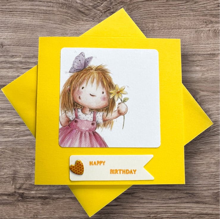 A bright and cheerful yellow card with a cute little girl in a pretty pink pinafore in a simplistic retro fairytale design.