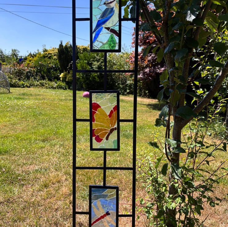 Here is a finished piece with 3 different mosaics in one stand. The frame is black metal, designed to stand in the garden or a large pot as a focal point. In this piece I wanted to show some of the wildlife we can expect to see in out gardens, a blue tit in a tree, a butterfly in a bush and a dragonfy over a pond. This is suitable for indoors or outdoors. There are many mosaics which are all different so ones can be chosen to peronal taste,