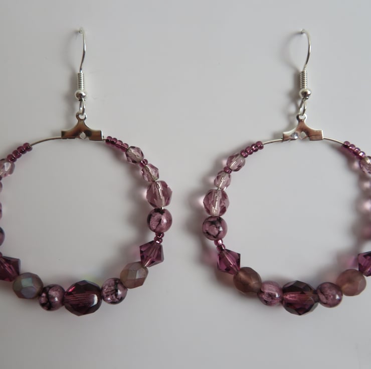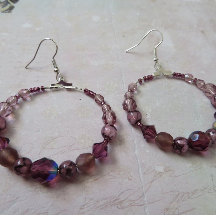 Handcrafted by myself, these pretty silver-tone amethyst shaded retro hooped earrings are a one-of-a-kind creation.