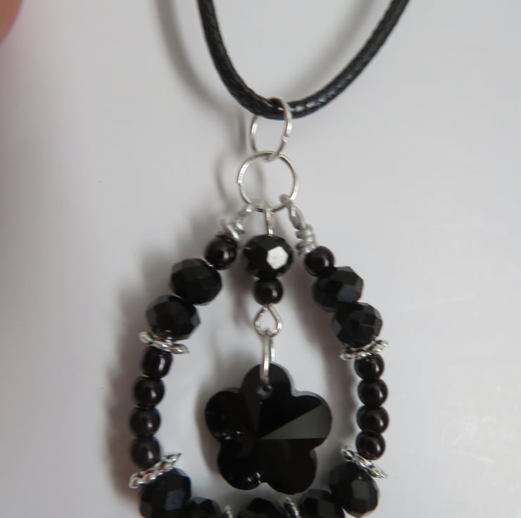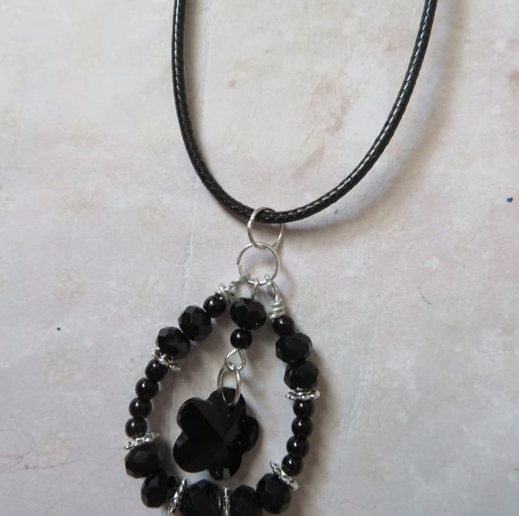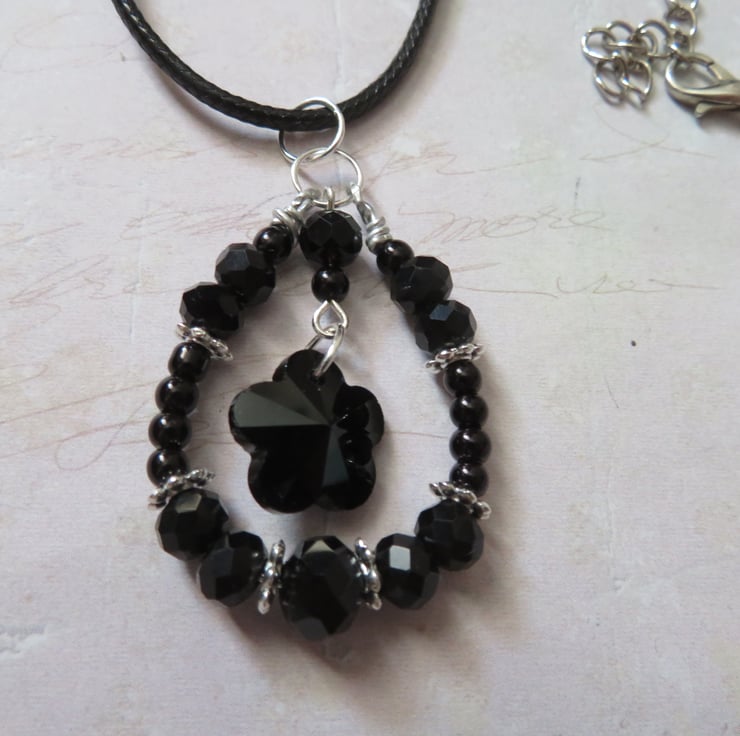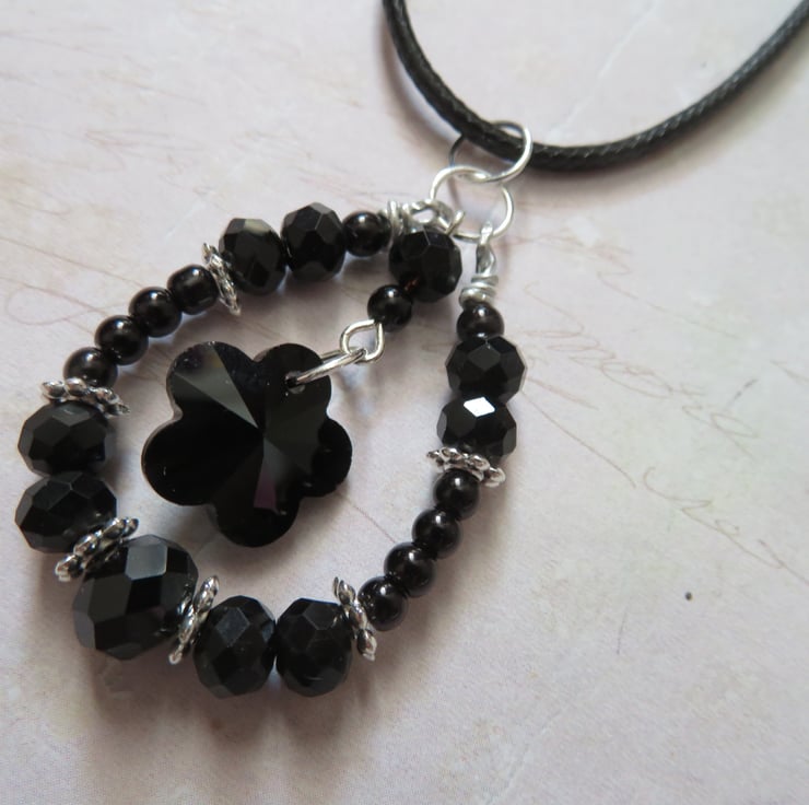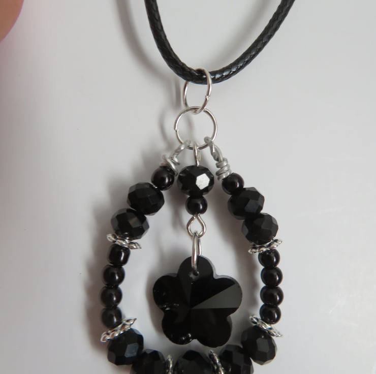 This pretty and unique necklace features a hand-wired loop pendant, with black rondelle crystals, silver flower spacer beads and small black pearls.