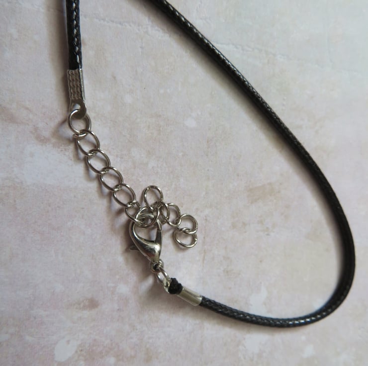 The pendant is strung on a thin black braid choker necklace with a lobster clasp and extender chain.