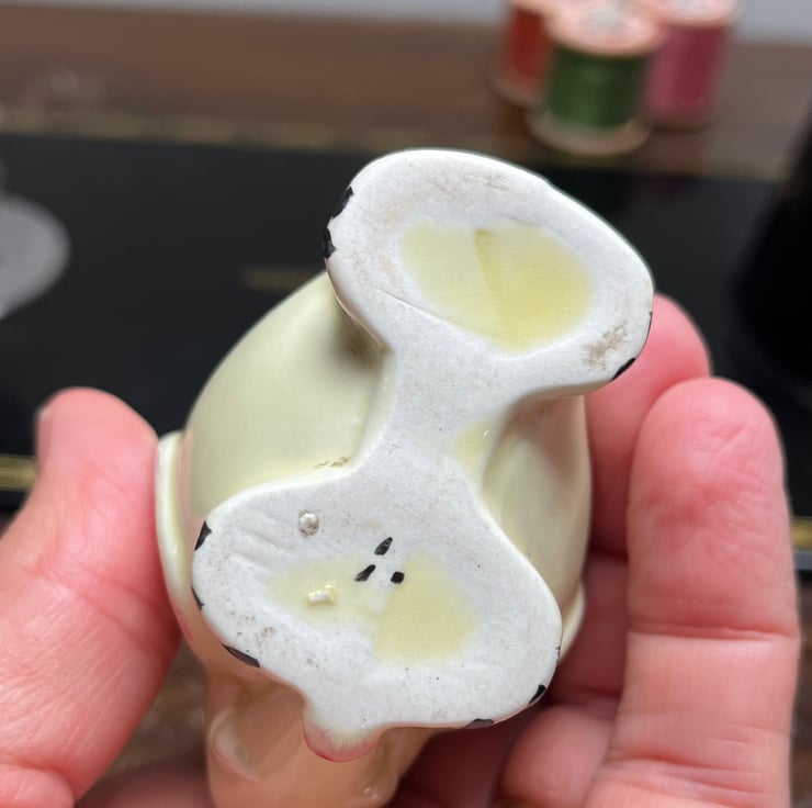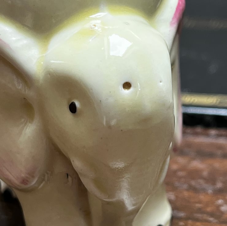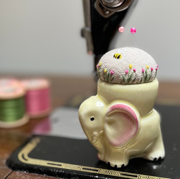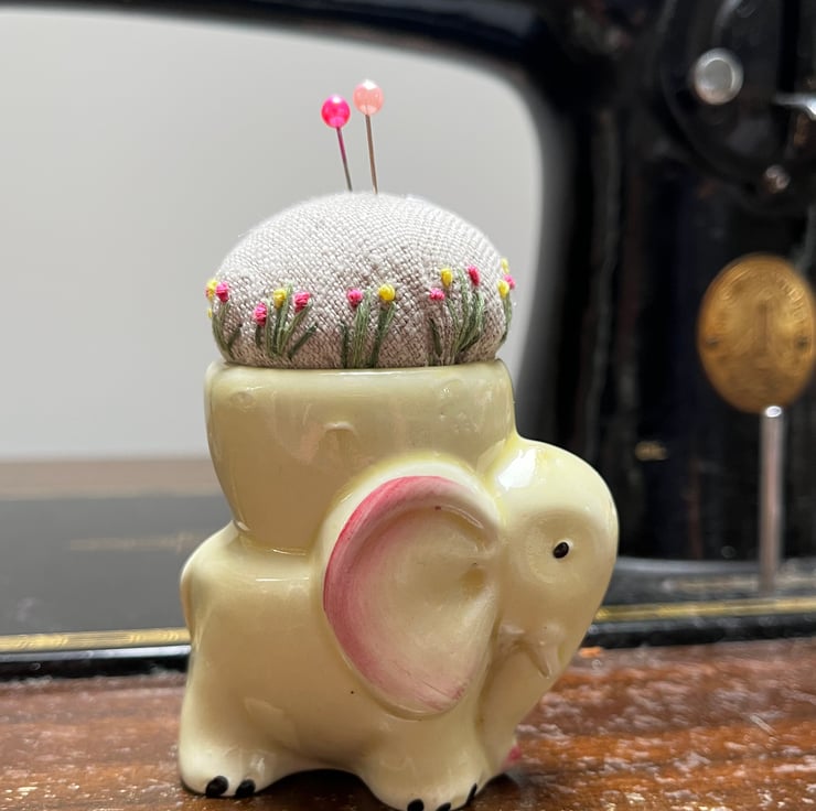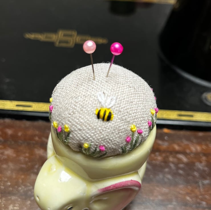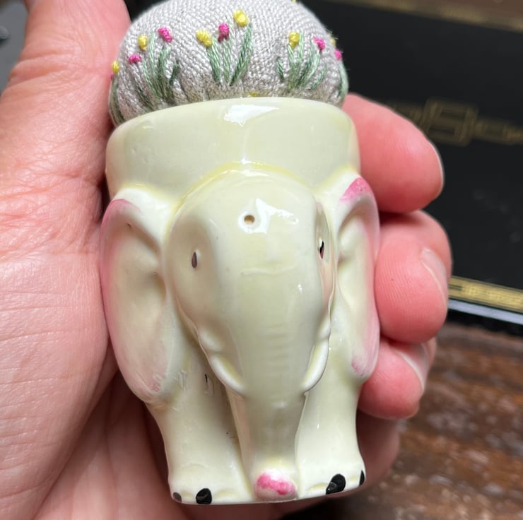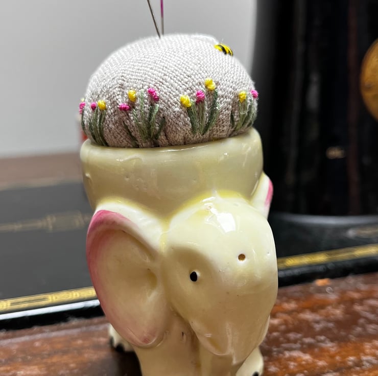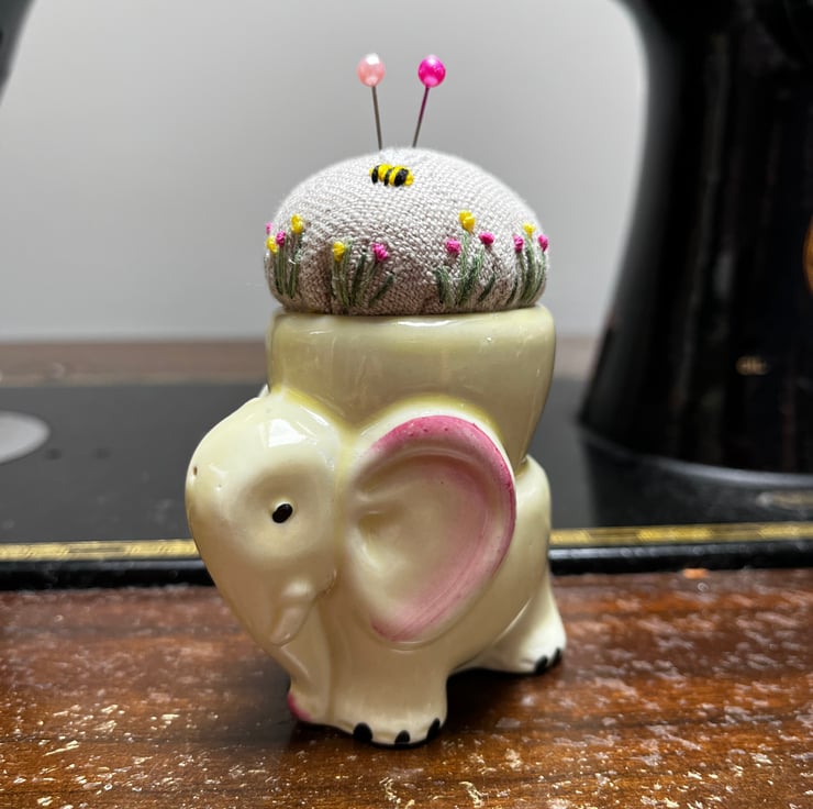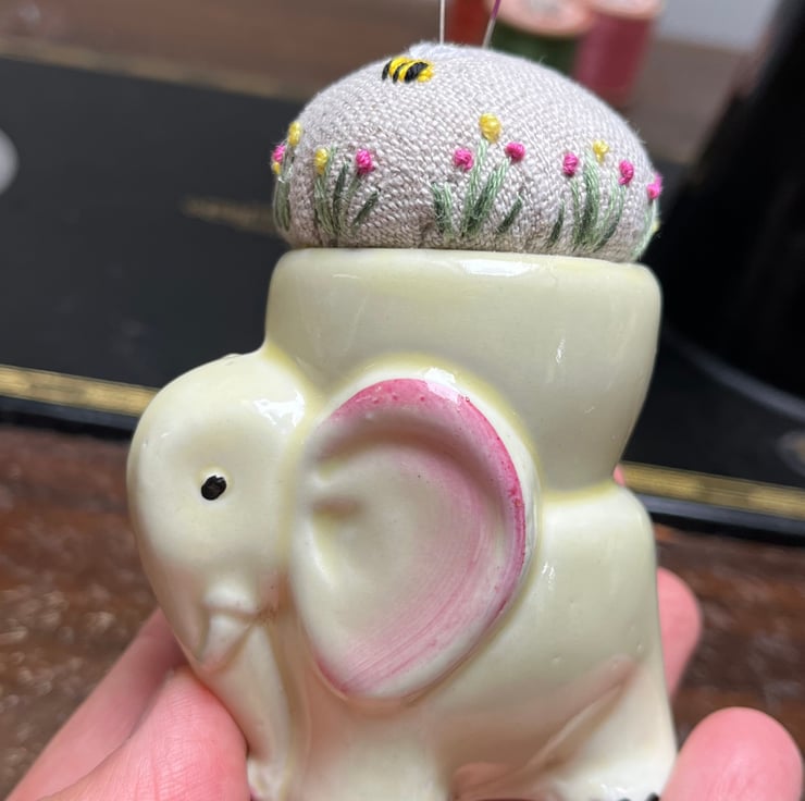 Cute embroidered pincushion in a vintage egg cup in the shape of an elephant. The reclaimed linen cushion has been embroidered with tiny flowers and a bee.