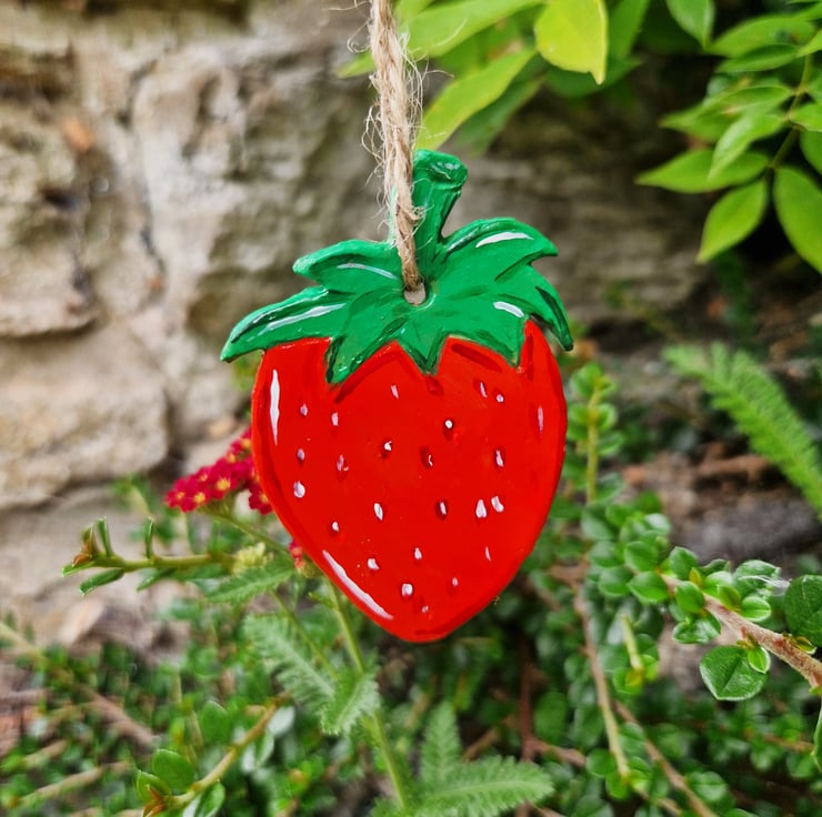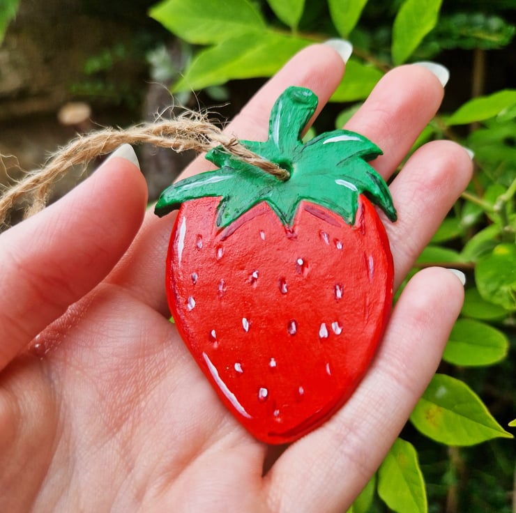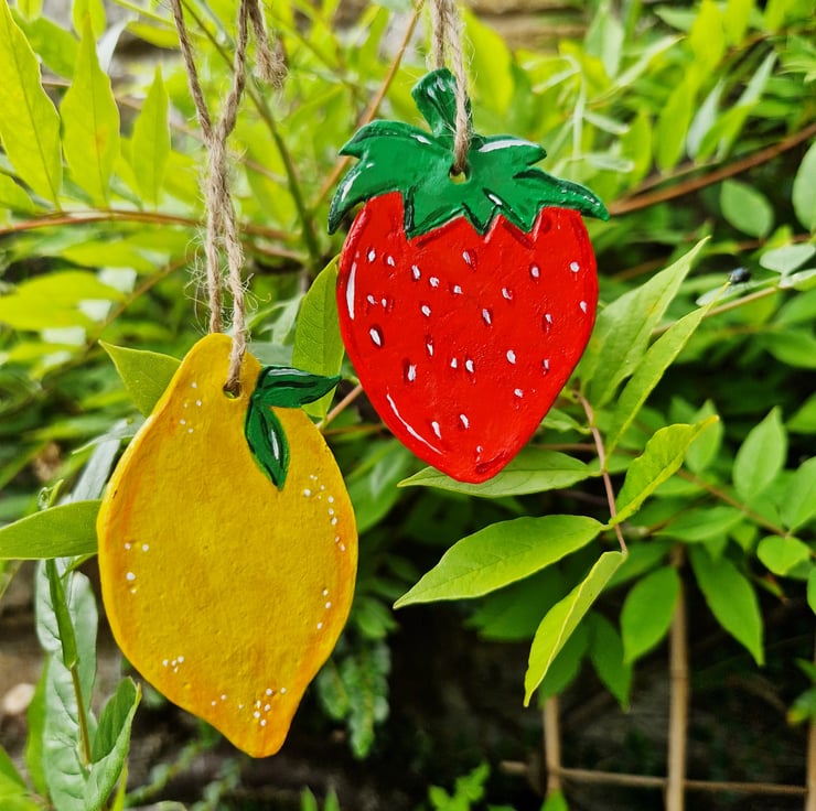 A lemon and strawberry hanging decoration set! Perfect cheerful summer decor, or even as hanging decorations for cocktail bars! Each clay decoration is individually handmade and painted, making each set completely unique! Please do bear this in mind as they may differ slightly than pictured for that reason.
