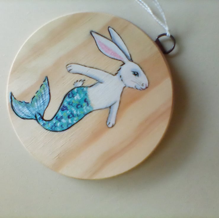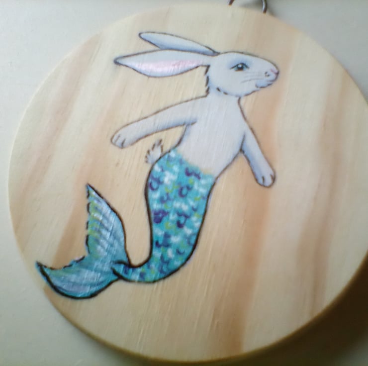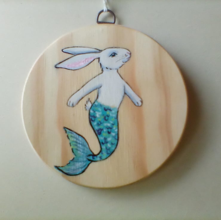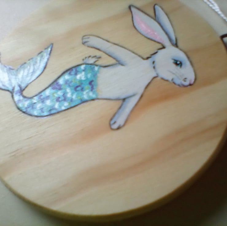 This is a wooden disc, hand painted with a Merbunny (half bunny, half mermaid).