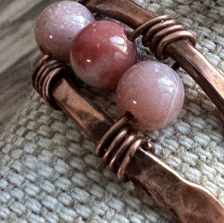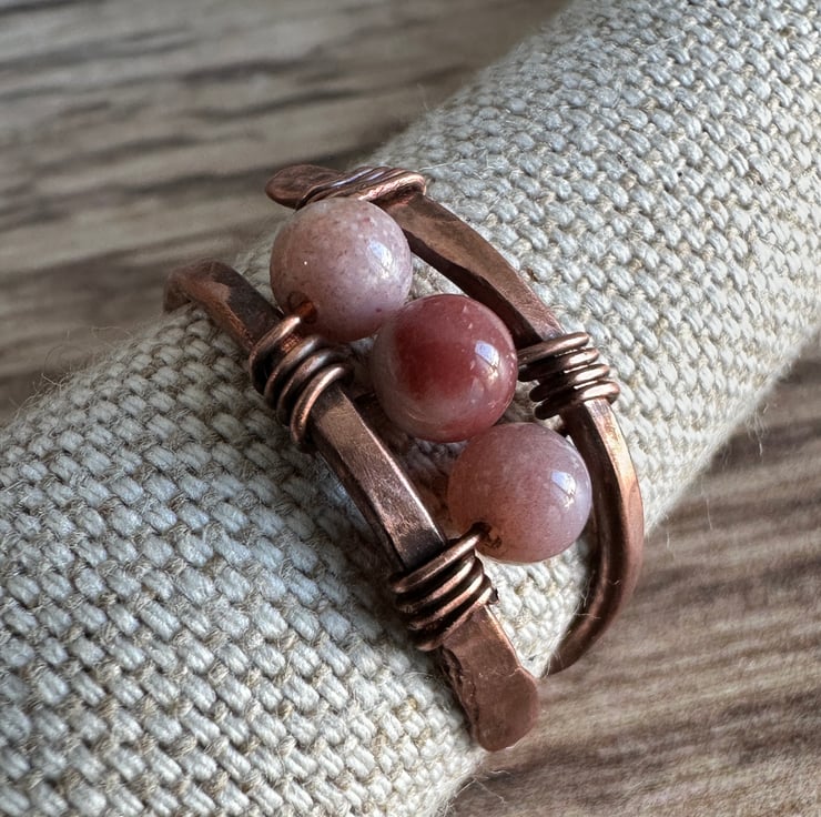 This elegant ring is handcrafted from solid 14-gauge copper wire and adorned with three soft pink agate stones for a gentle pop of colour. The copper has been lightly hammered for texture and strength, creating a rustic yet refined finish that’s perfect for everyday wear.
