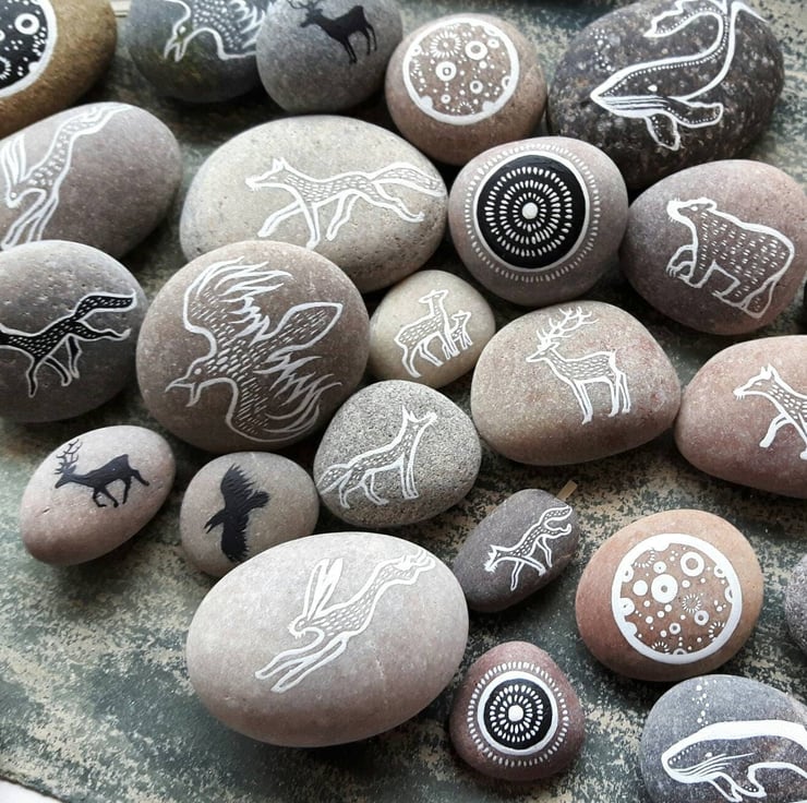These rock paintings are composed of real stones, acrylic ink and acrylic paint and sometimes varnish