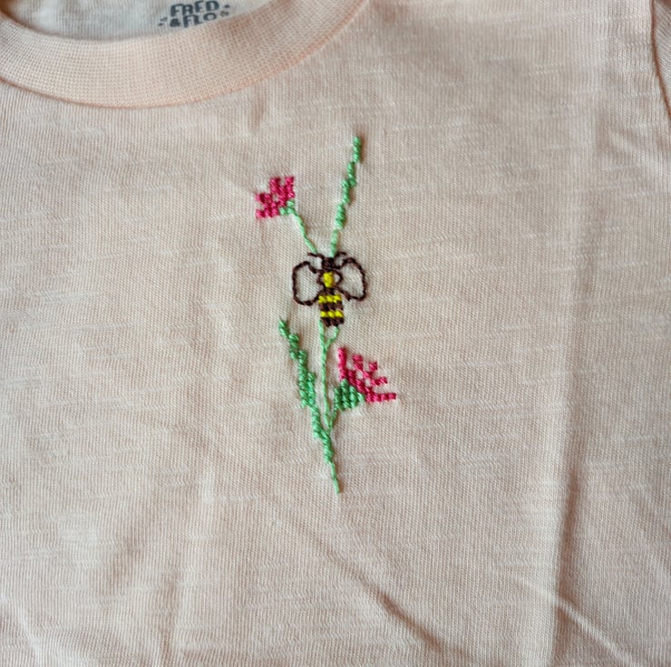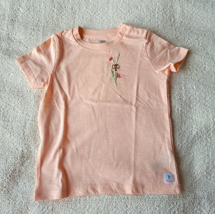 I have hand embroidered a bee visiting a spray of pink flowers on this pretty pale peach T-shirt. As I never use a permanent backing material when cross stitching designs on kids' clothing, there is nothing inside to irritate your child's skin. The shirt is lightly textured, has a round neck and short sleeves and two press studs on the left shoulder. It is all cotton and can be machine washed.