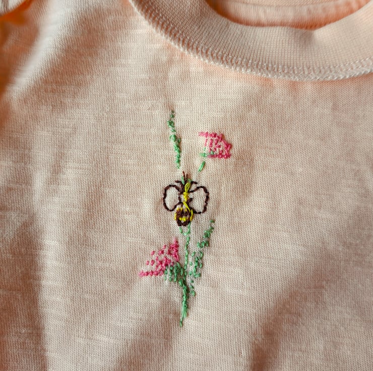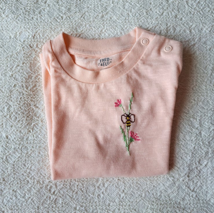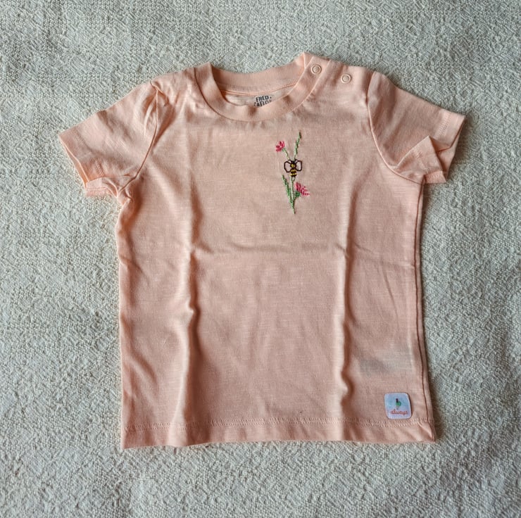 I have hand embroidered a bee visiting a spray of pink flowers on this pretty pale peach T-shirt. As I never use a permanent backing material when cross stitching designs on kids' clothing, there is nothing inside to irritate your child's skin. The shirt is lightly textured, has a round neck and short sleeves and two press studs on the left shoulder. It is all cotton and can be machine washed.