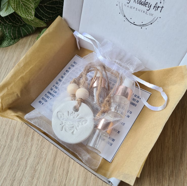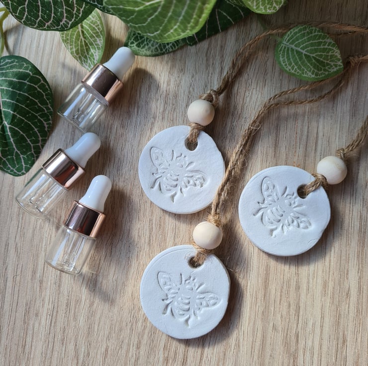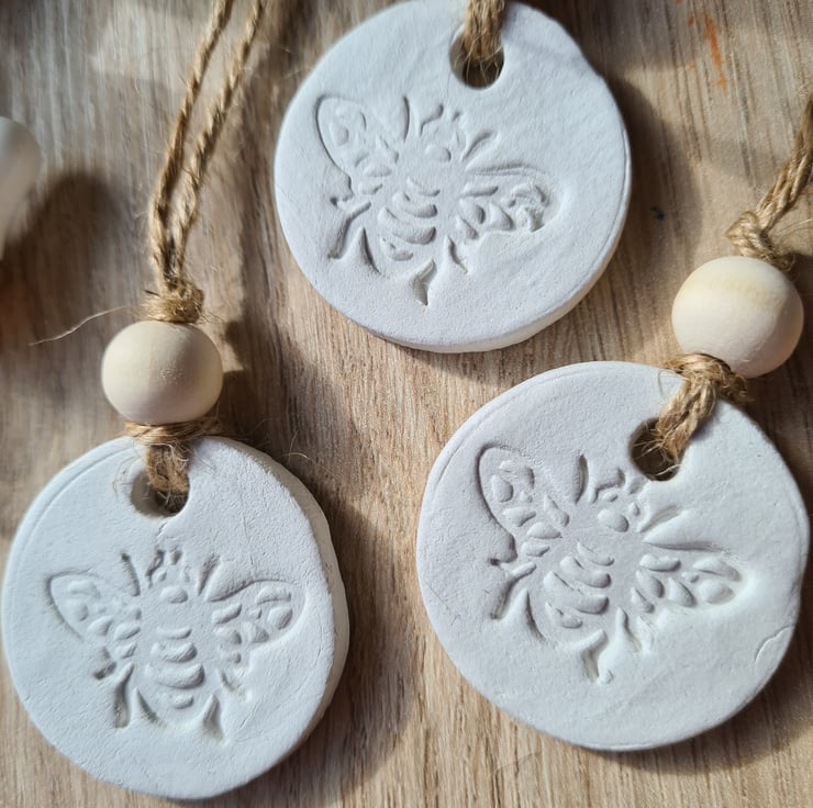 This set of three pretty round hanging decorations are made from air-drying clay embossed with a pretty bee design, and finished with twine and a wooden bead. They are unsealed to absorb essential oil.