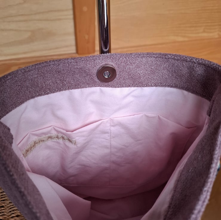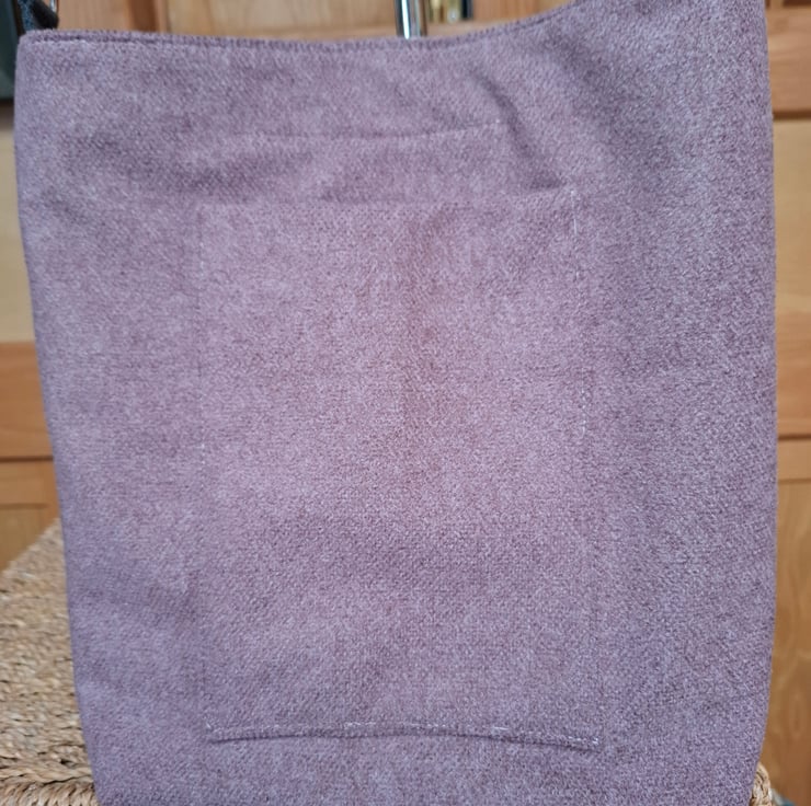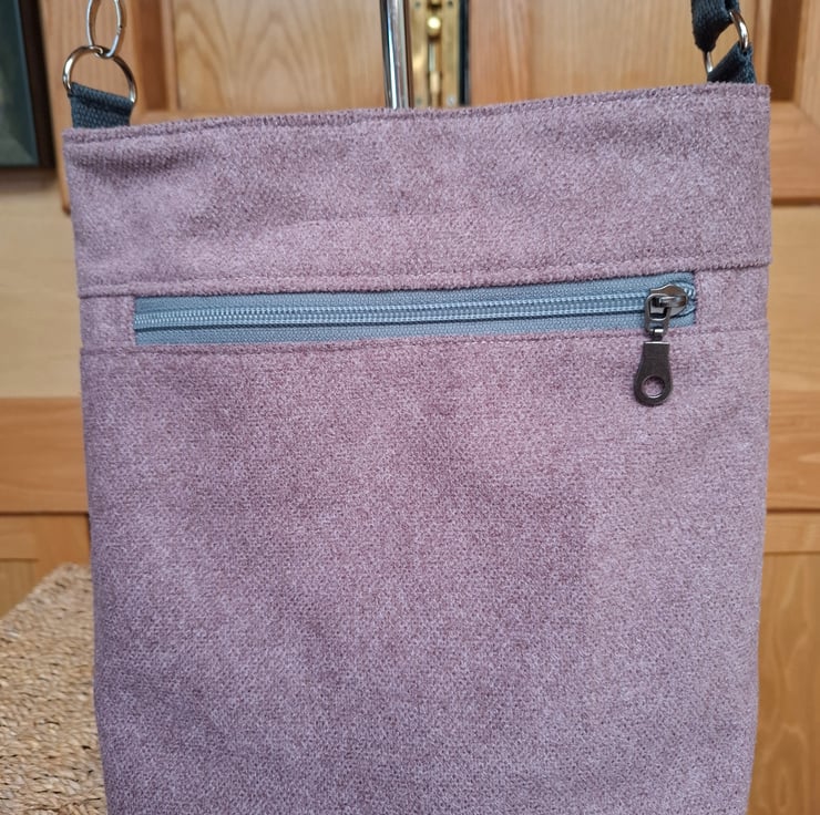 Smart crossbody bag in dusky pink tweed, with zipped and patch outer pockets. Lined in pink cotton, with inner pockets, magnetic fastener and adjustable cotton webbing strap.