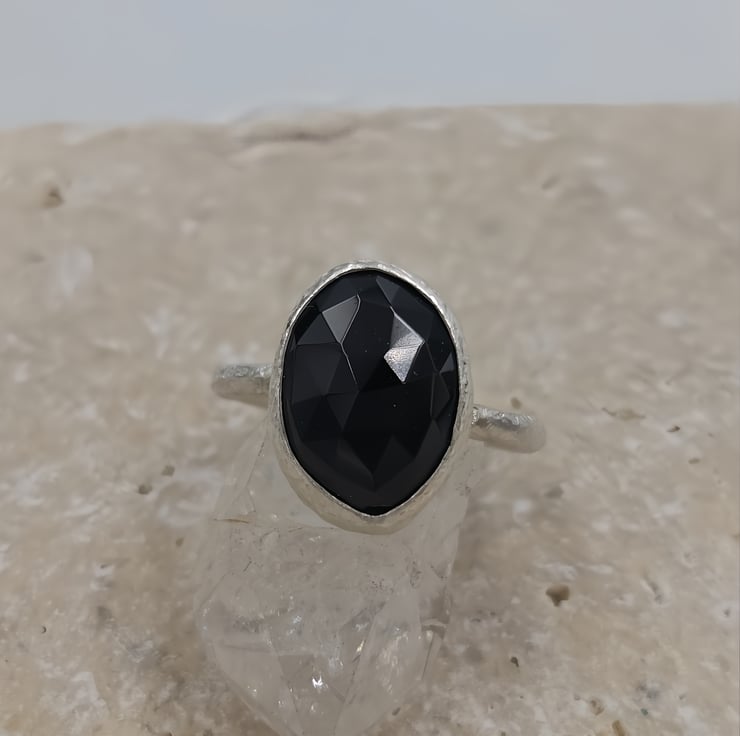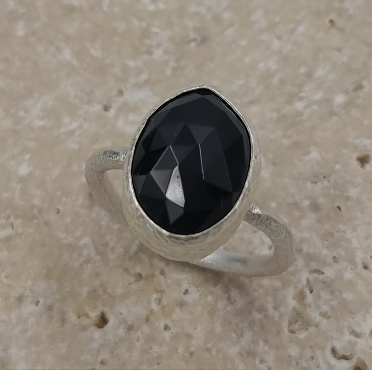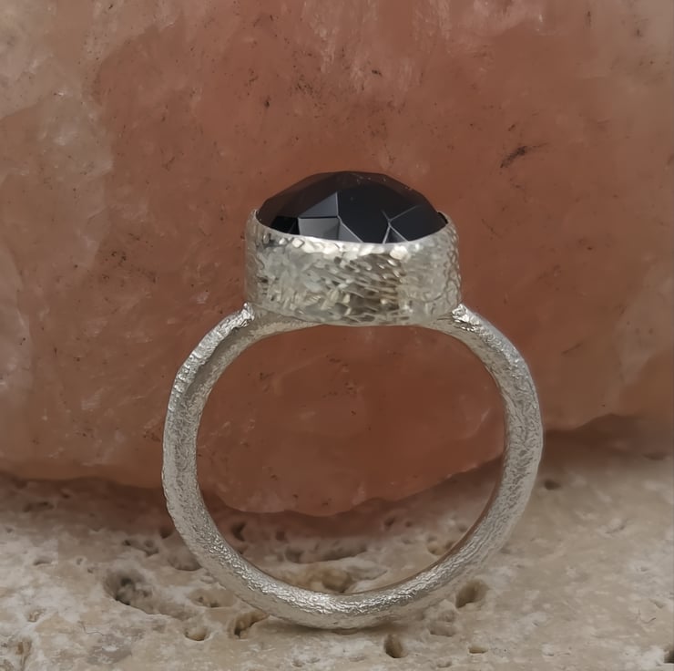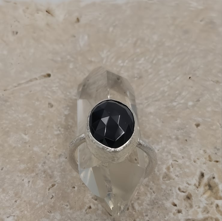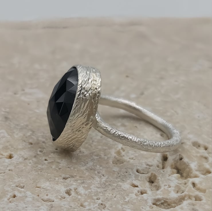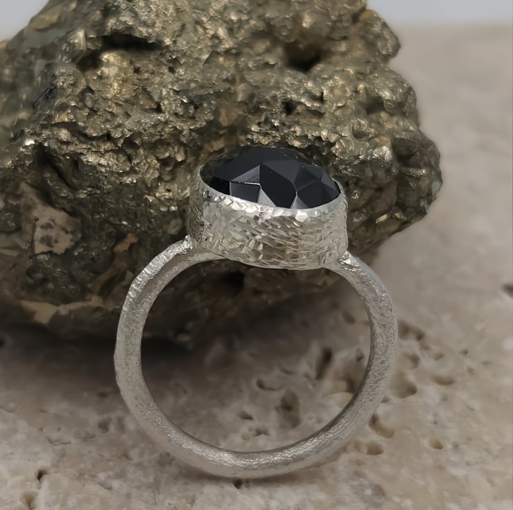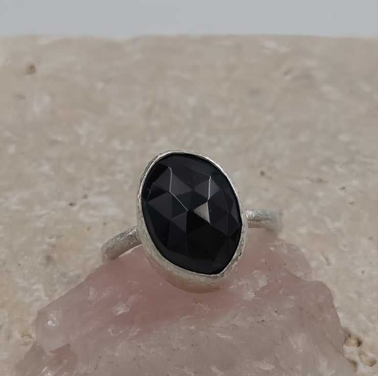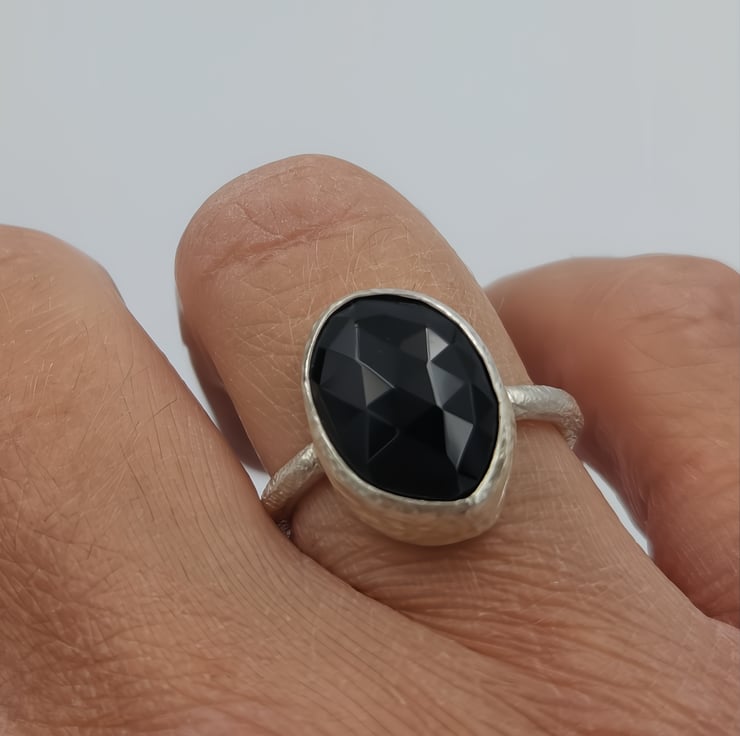 This handmade sterling silver ring features a captivating 14 x 10 mm oval black spinel slice, rose-cut to enhance its natural depth and reflective facets. The subtle sparkle of the hand-cut gem catches light like water on stone, offering a moody elegance that shifts beautifully from day to night.