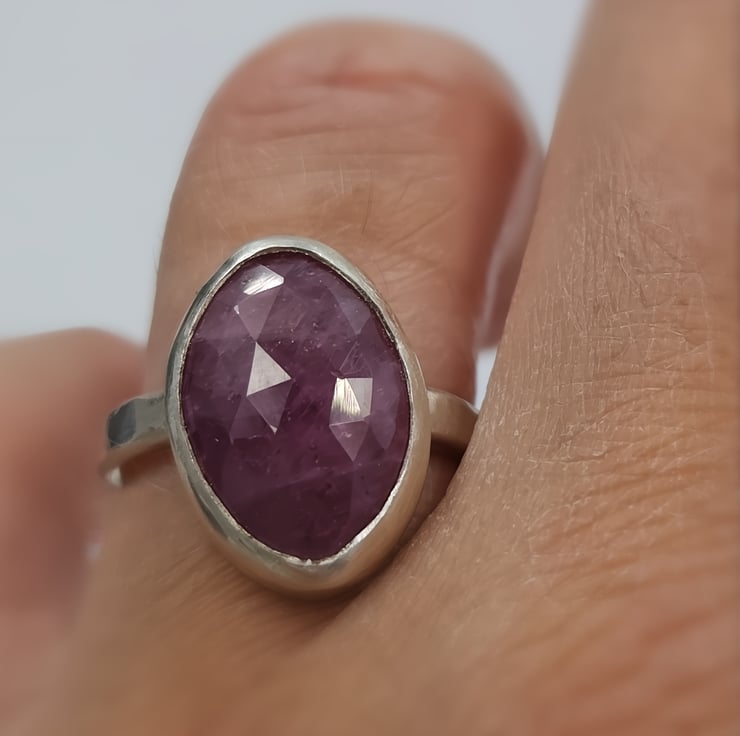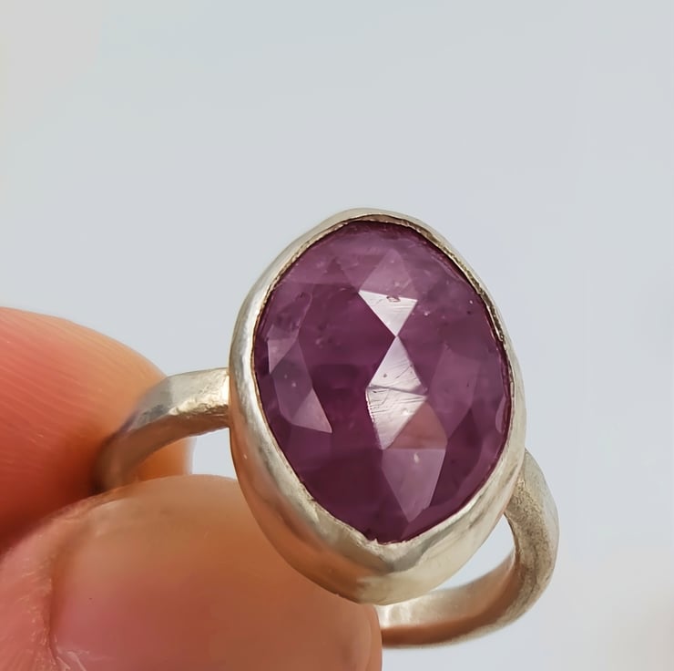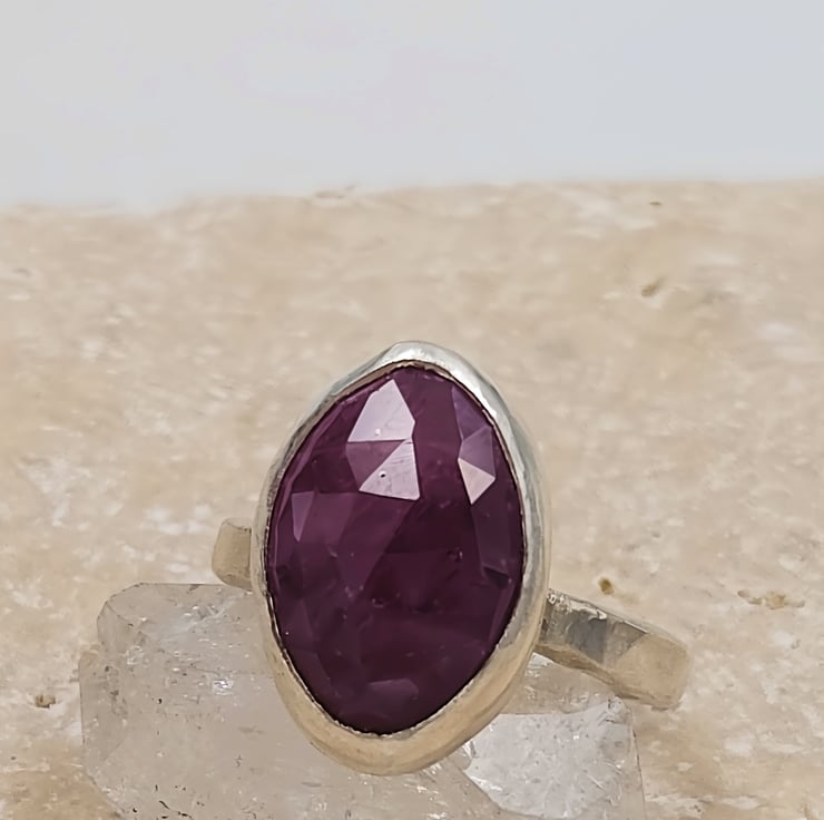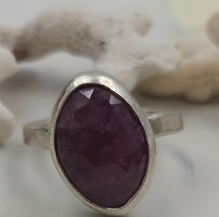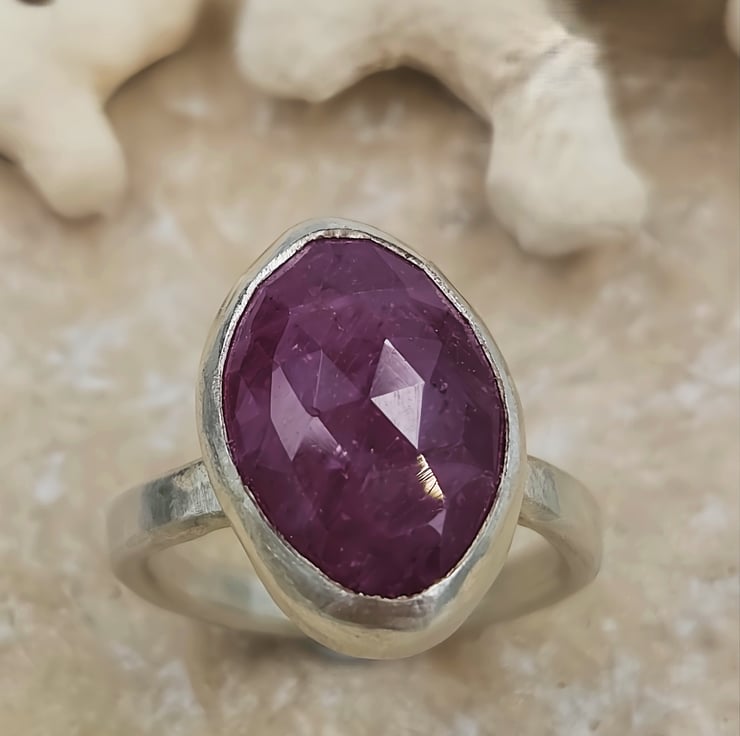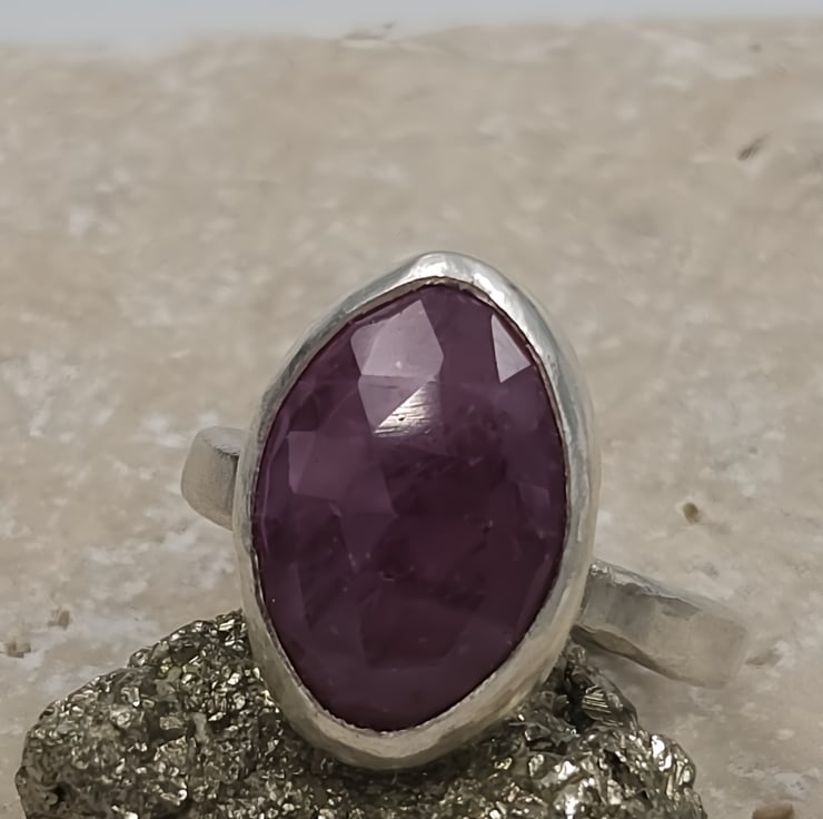 Discover the raw elegance of nature fused with artisan craftsmanship in this oval pink sapphire slice ring, bezel-set in molten textured, hand-forged sterling silver. Designed for those who appreciate unique, soulful jewellery, this piece brings together the delicacy of a soft pink gemstone and the strength of organically sculpted silver. Every detail of this ring speaks of intention, transformation, and individuality.