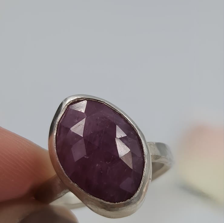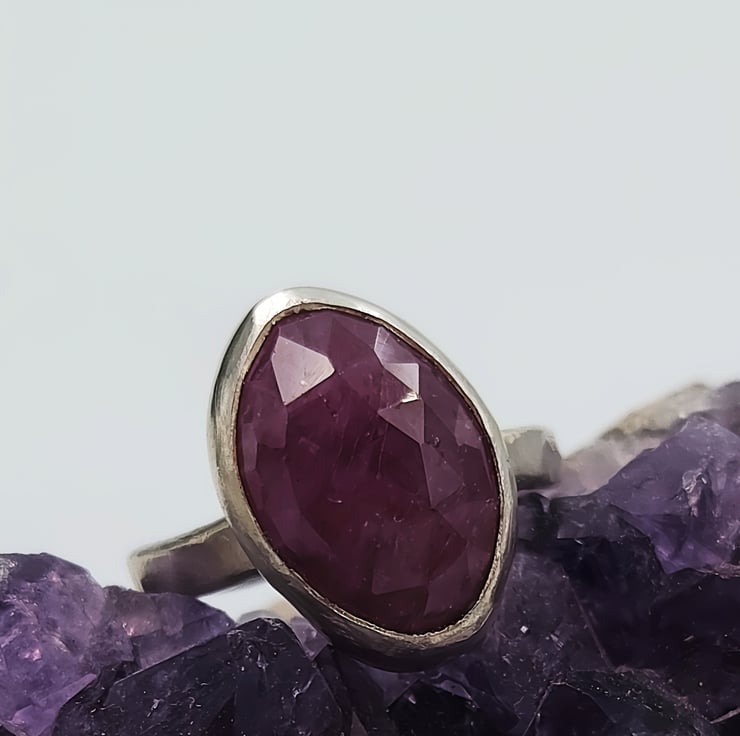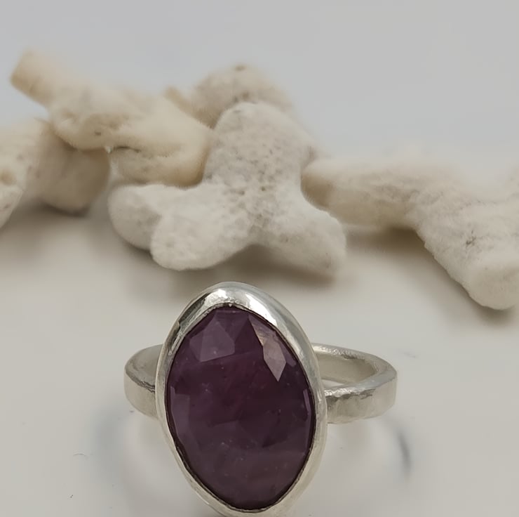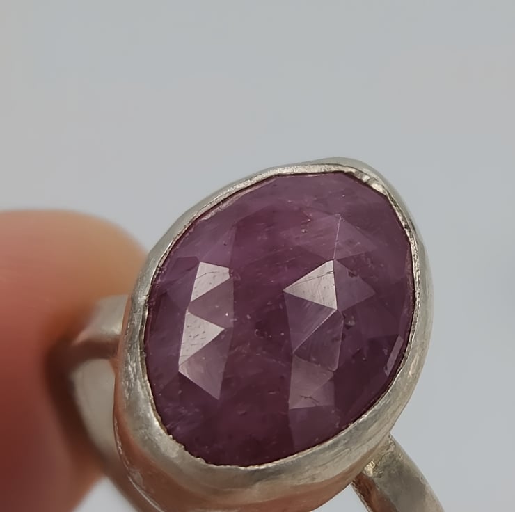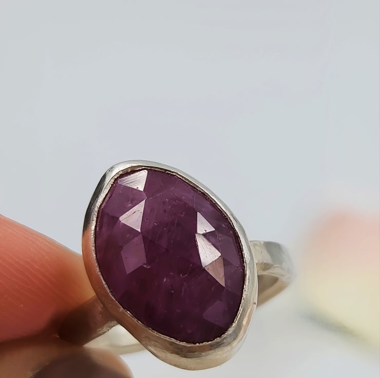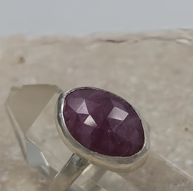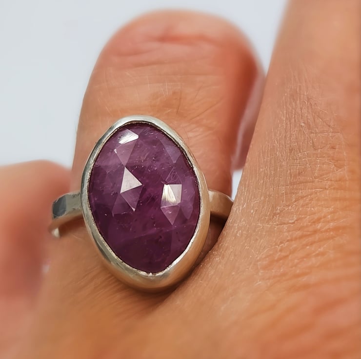 Discover the raw elegance of nature fused with artisan craftsmanship in this oval pink sapphire slice ring, bezel-set in molten textured, hand-forged sterling silver. Designed for those who appreciate unique, soulful jewellery, this piece brings together the delicacy of a soft pink gemstone and the strength of organically sculpted silver. Every detail of this ring speaks of intention, transformation, and individuality.