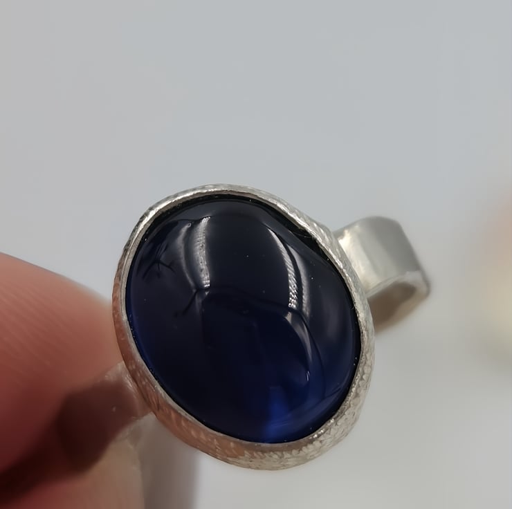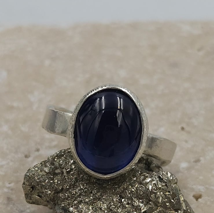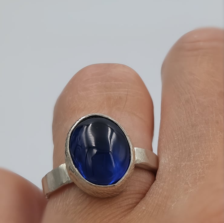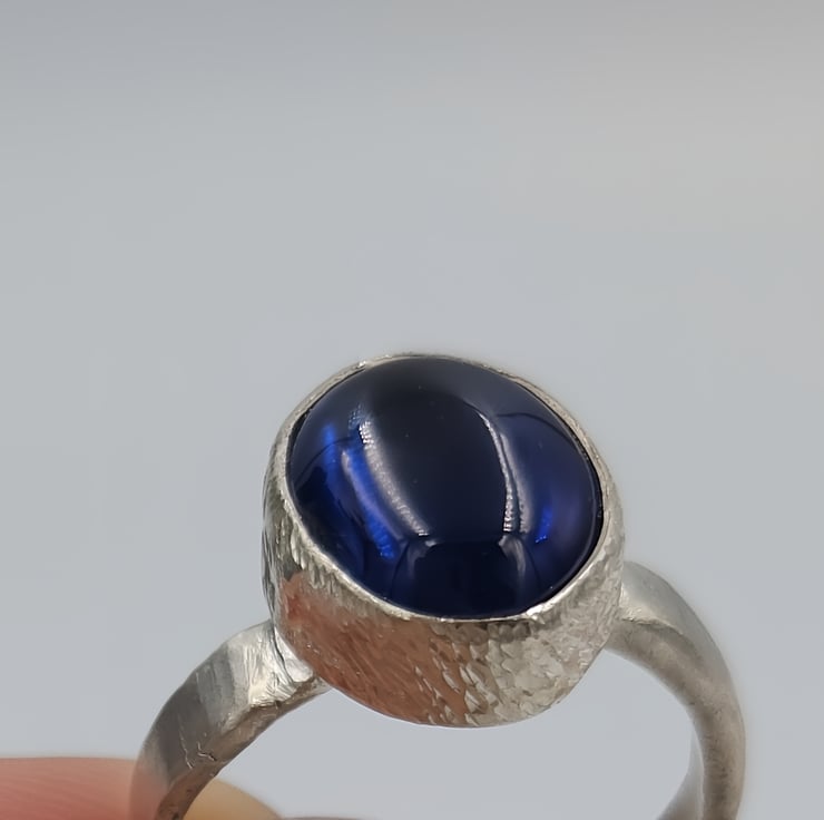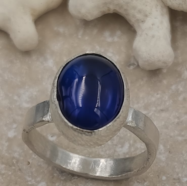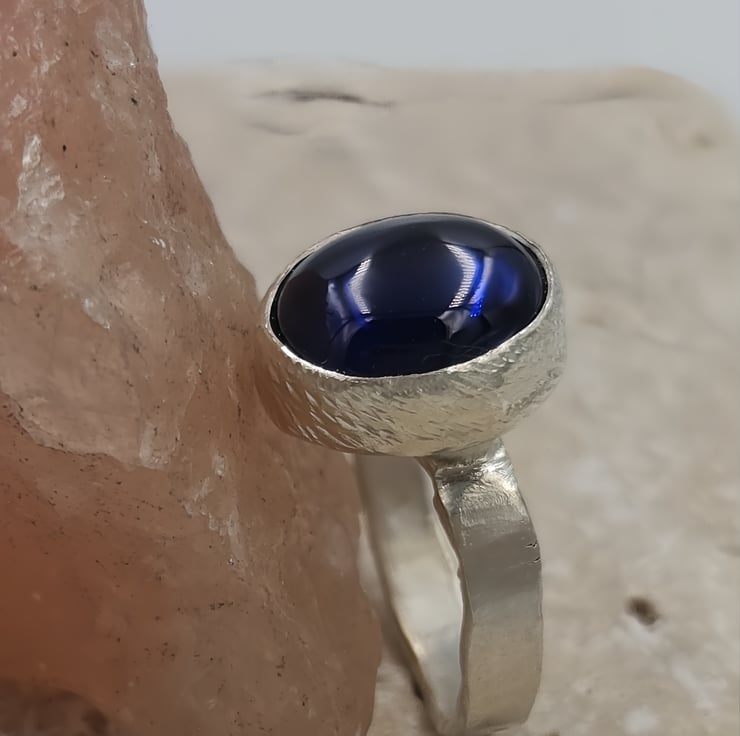 This handcrafted ring features a stunning oval synthetic sapphire, bezel set in molten textured sterling silver for a bold, organic look. The ring is hand-forged from solid .925 silver, shaped and finished by hand to create a flowing, raw surface that mimics the look of cooled lava or molten metal.