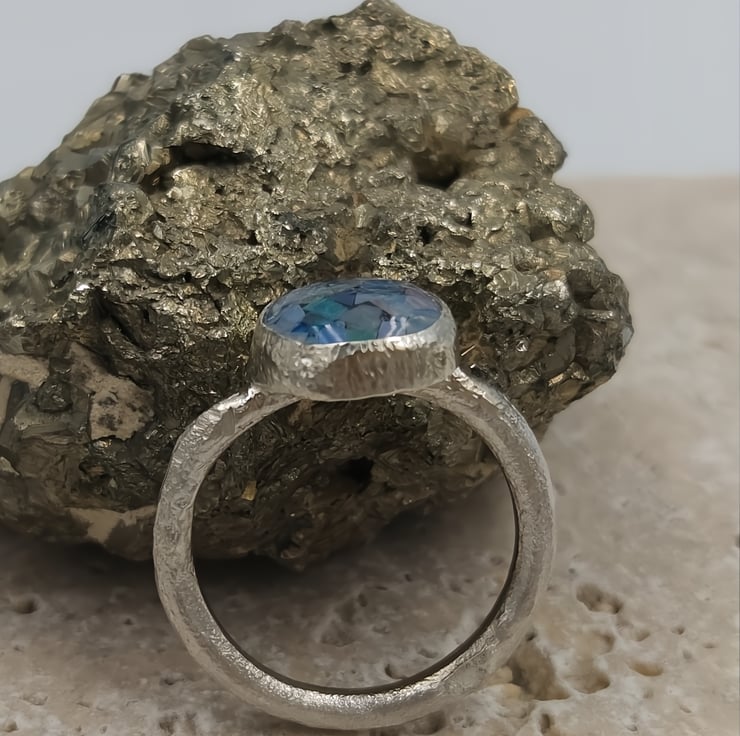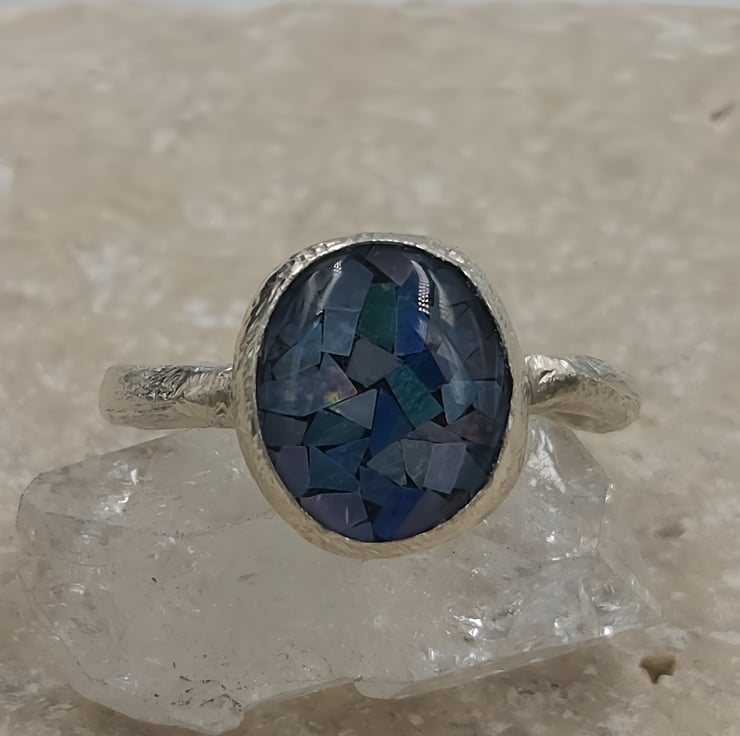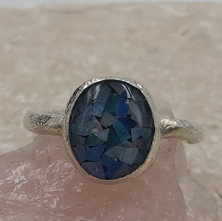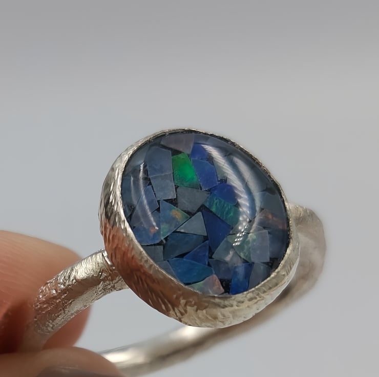 This handcrafted opal mosaic ring is a vibrant, one-of-a-kind piece, set in richly textured molten sterling silver. This ring is hand-forged and shaped individually, resulting in an organic, lava-like texture that flows across the surface — raw, imperfect, and strikingly beautiful.