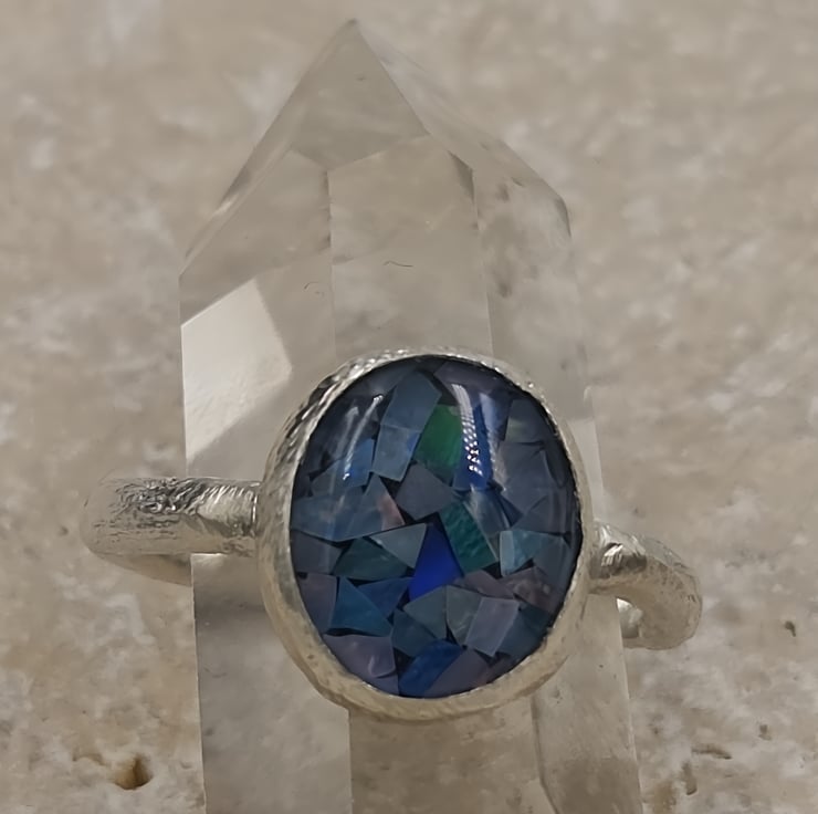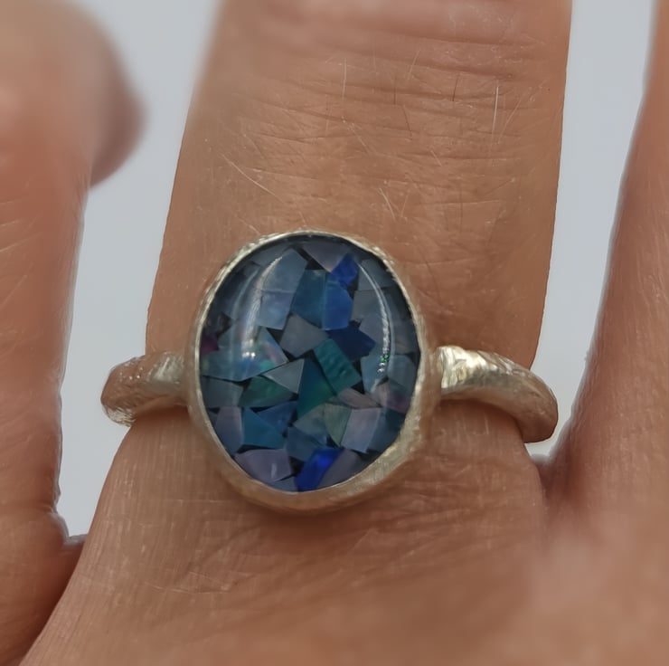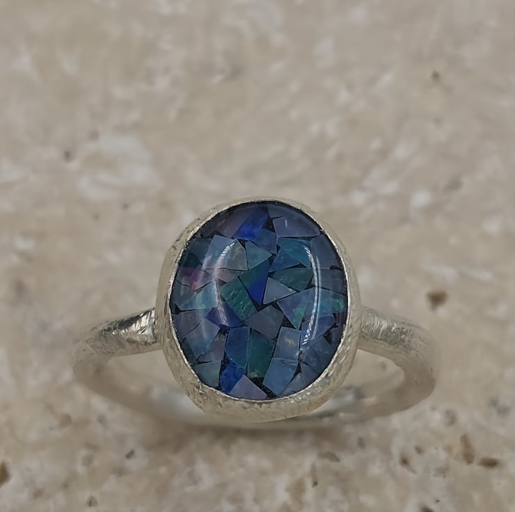 The centrepiece is a glowing opal mosaic, made from carefully selected opal fragments set in a smooth bezel. The opal shimmers with flashes of blue, green, pink, and orange — a play of colour that shifts with movement and light. The mosaic style adds depth and character to the stone, making each ring entirely unique.