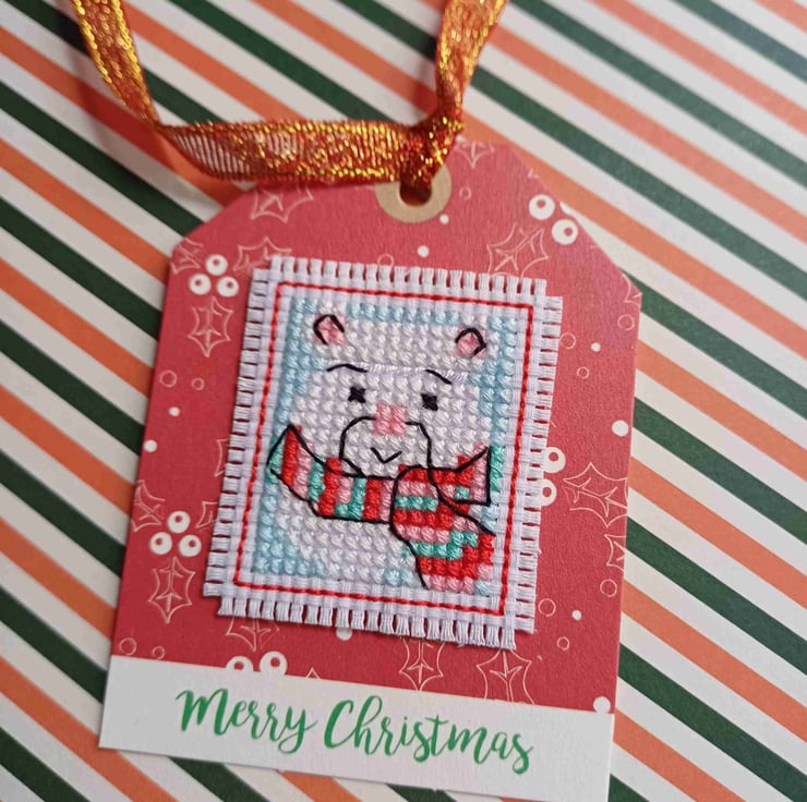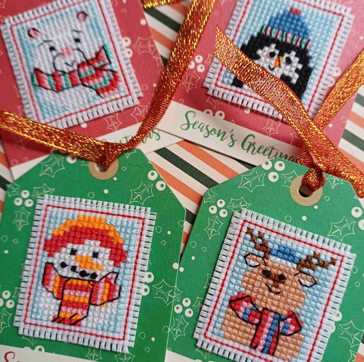 Each tag measures approximately 6x8cm. The cross stitch panel is 4x4cm. Lovely glitter ribbon to attach to gift.