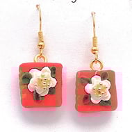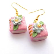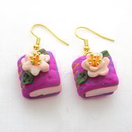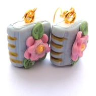 The earrings feature forget-me-not flowers on a white polymer clay cabochon background with each petal individually placed.