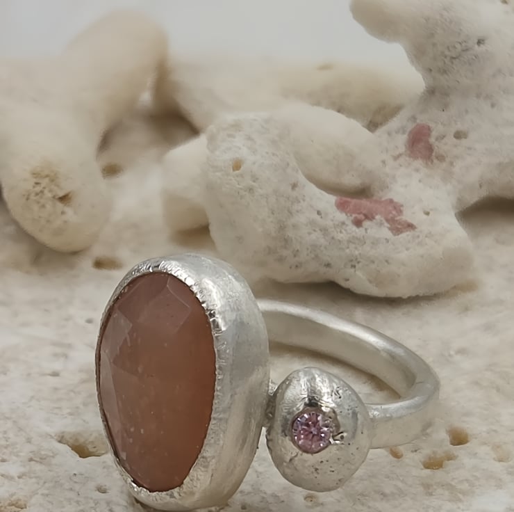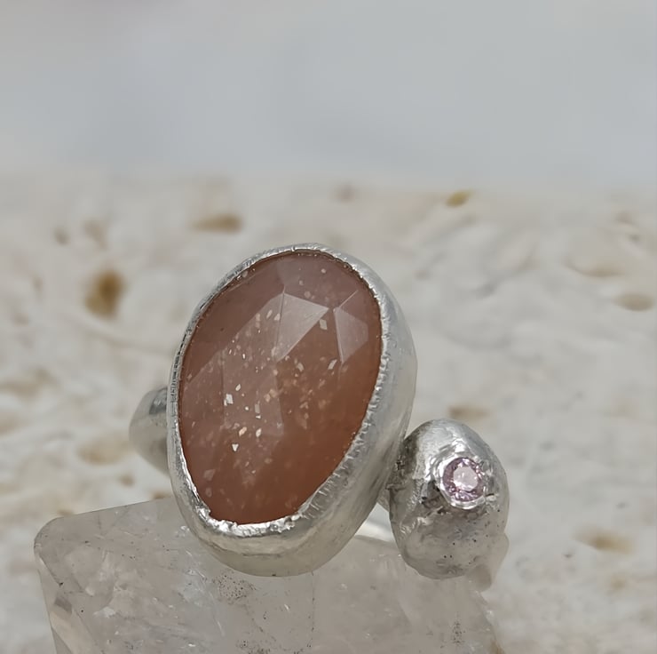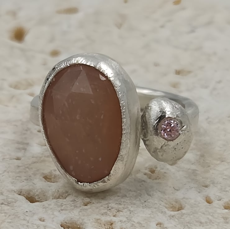 Delicately handcrafted, this one-of-a-kind ring features a stunning rose cut peach moonstone slice, bezel-set in richly textured sterling silver. The moonstone’s natural inclusions and soft shimmer evoke a quiet, ethereal beauty—offering a gentle glow that shifts with the light.