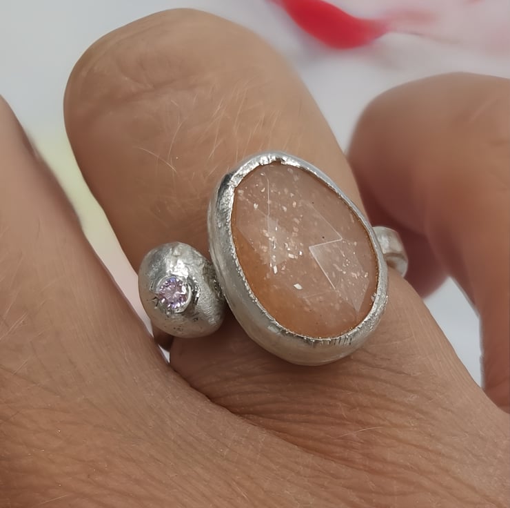 Adding a touch of intricate charm, a silver granule accent sits beside the bezel—set with a 2mm pink cubic zirconia, which brings a subtle sparkle and a romantic contrast to the moonstone’s dreamy sheen. The band is forged and finished entirely by hand, with a lightly hammered texture for an organic feel and comfortable fit.