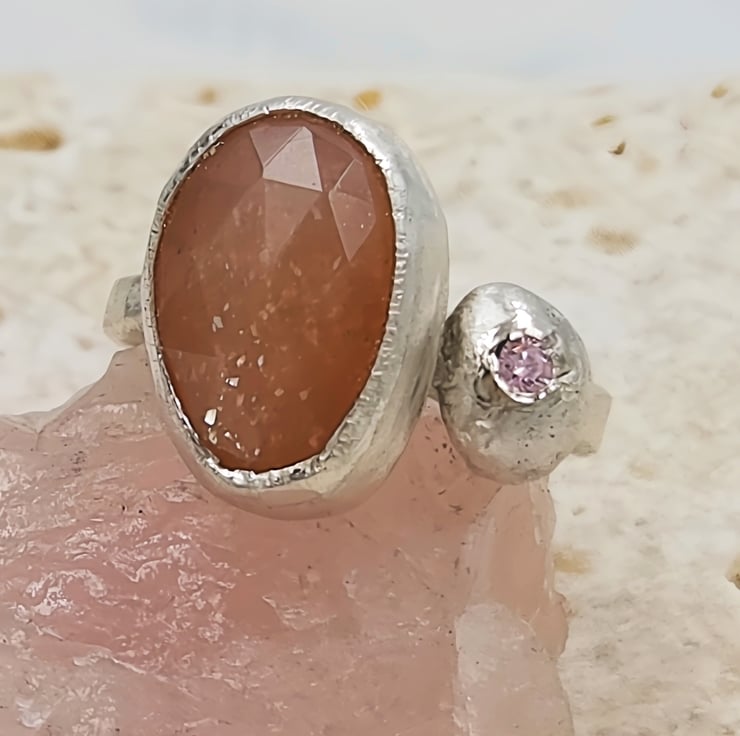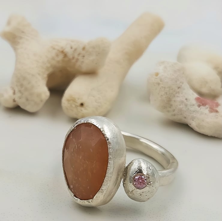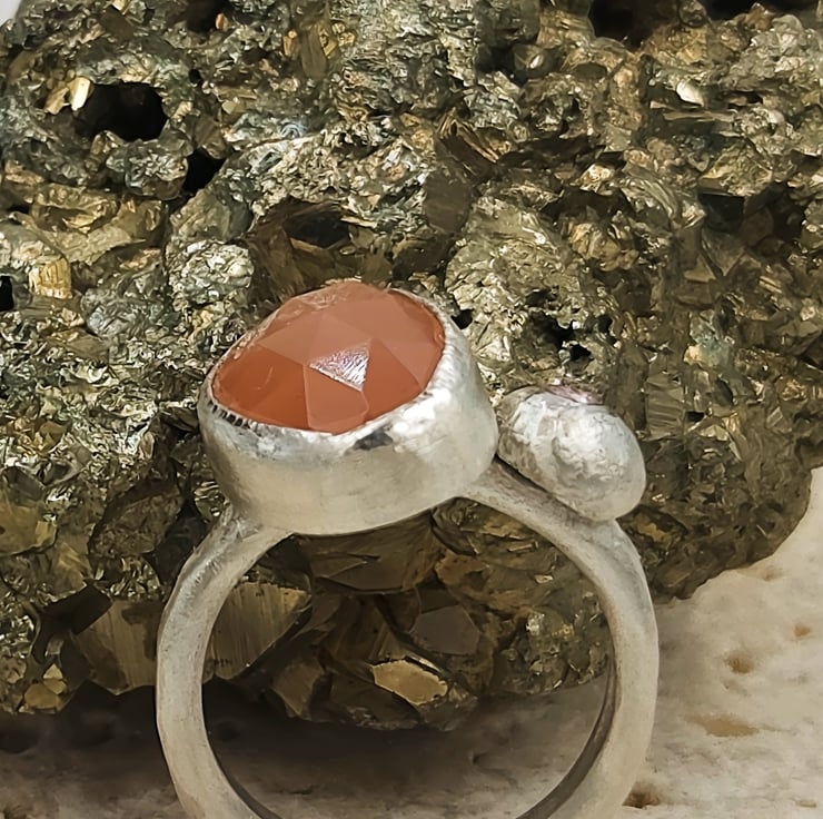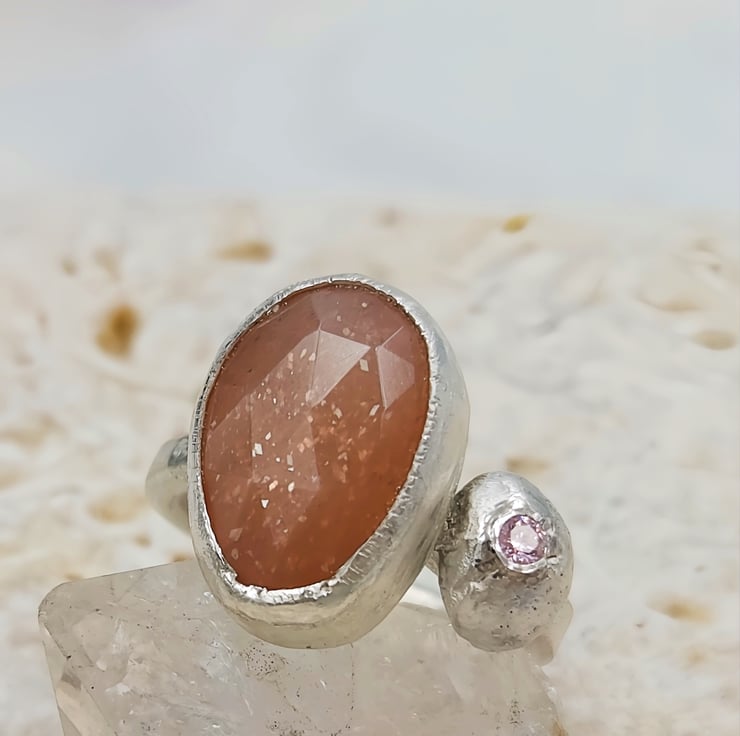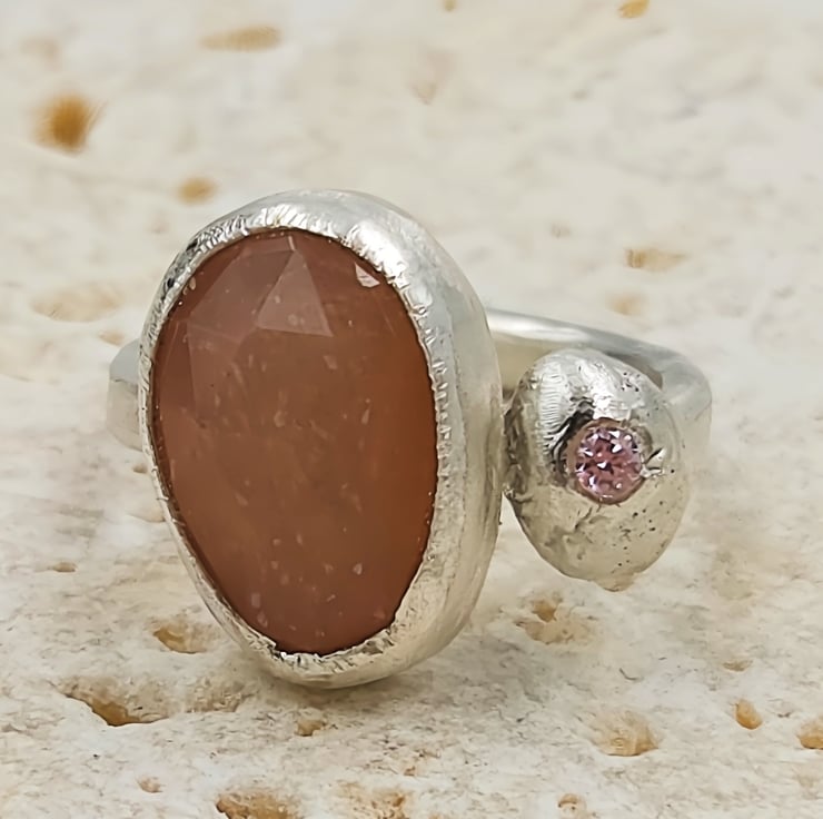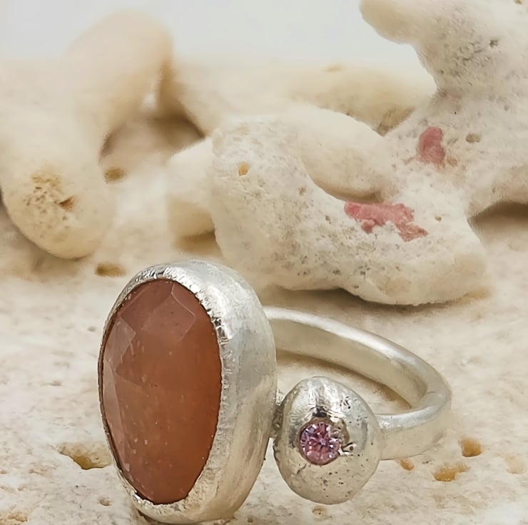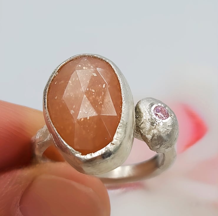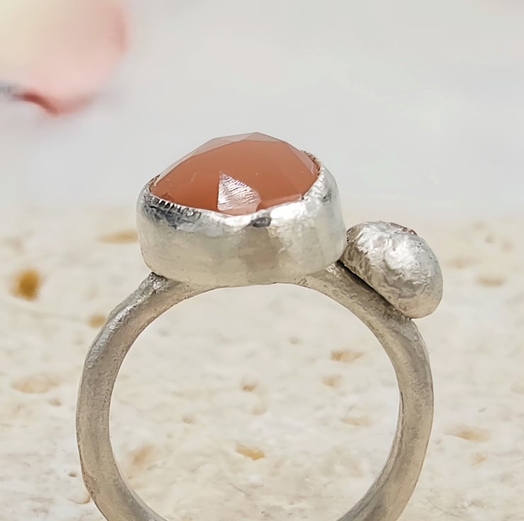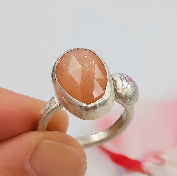 Delicately handcrafted, this one-of-a-kind ring features a stunning rose cut peach moonstone slice, bezel-set in richly textured sterling silver. The moonstone’s natural inclusions and soft shimmer evoke a quiet, ethereal beauty—offering a gentle glow that shifts with the light.