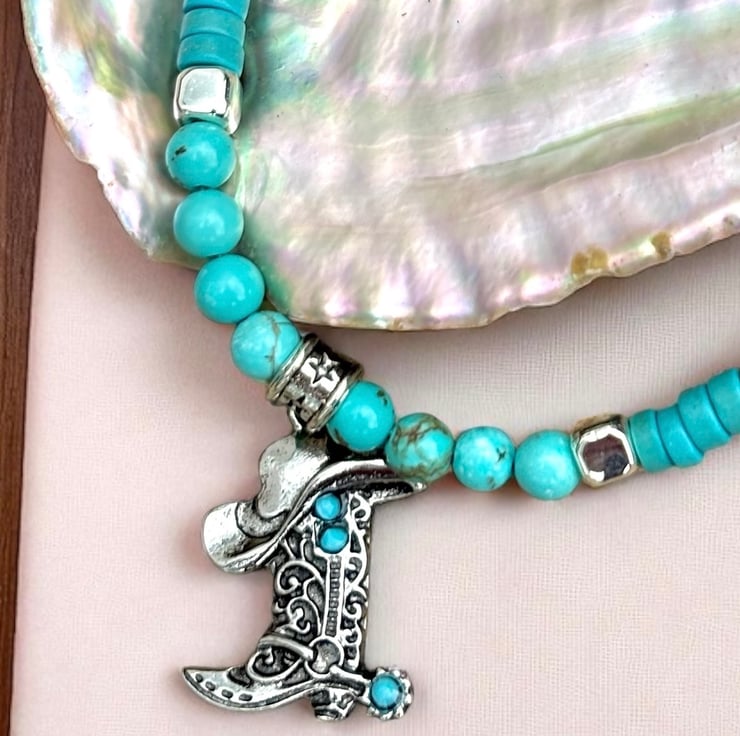 This charming 7” turquoise bracelet is a delightful blend of style and personality, featuring 4mm round turquoise Howlite beads and elegant 2x 4mm turquoise stone slices, all beautifully accented with silver-tone cube spacers. The standout cowboy boot and stetson charm adds a playful touch, making it the perfect gift for any country and Western enthusiast. The bracelet is lovingly designed and handmade by the seller and comes gift-wrapped in tissue and an organza bag, ready to surprise and delight your loved ones!