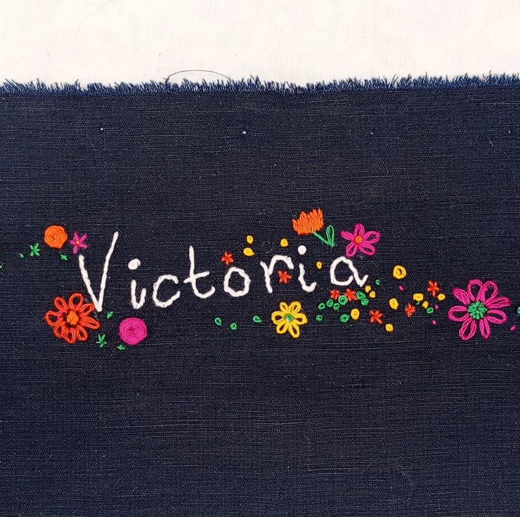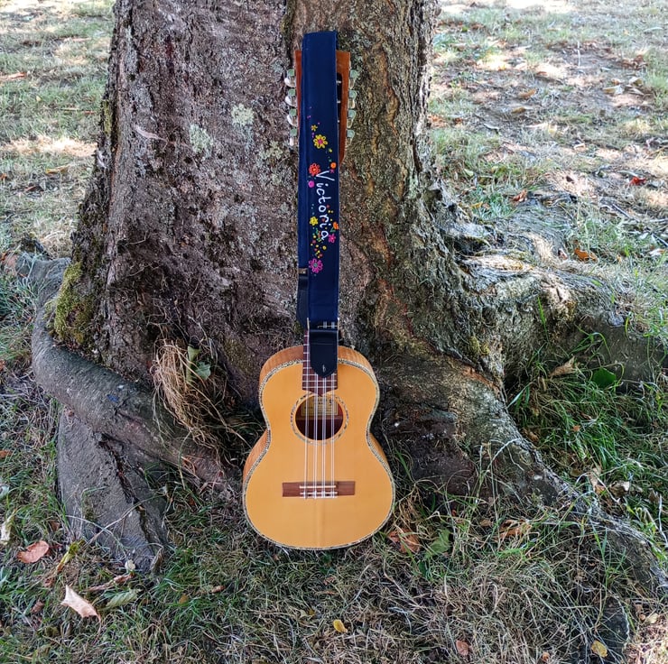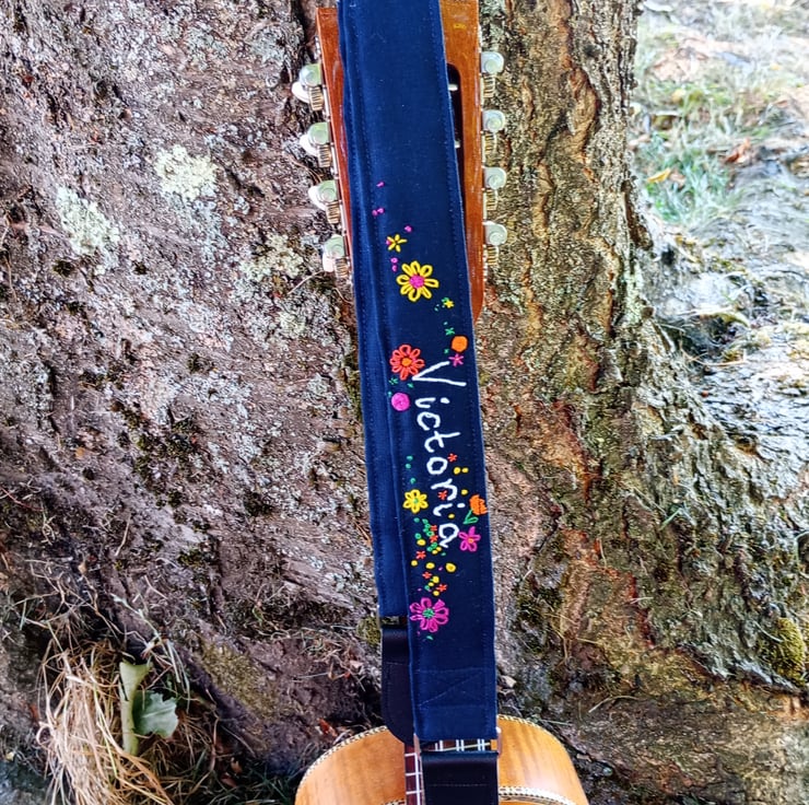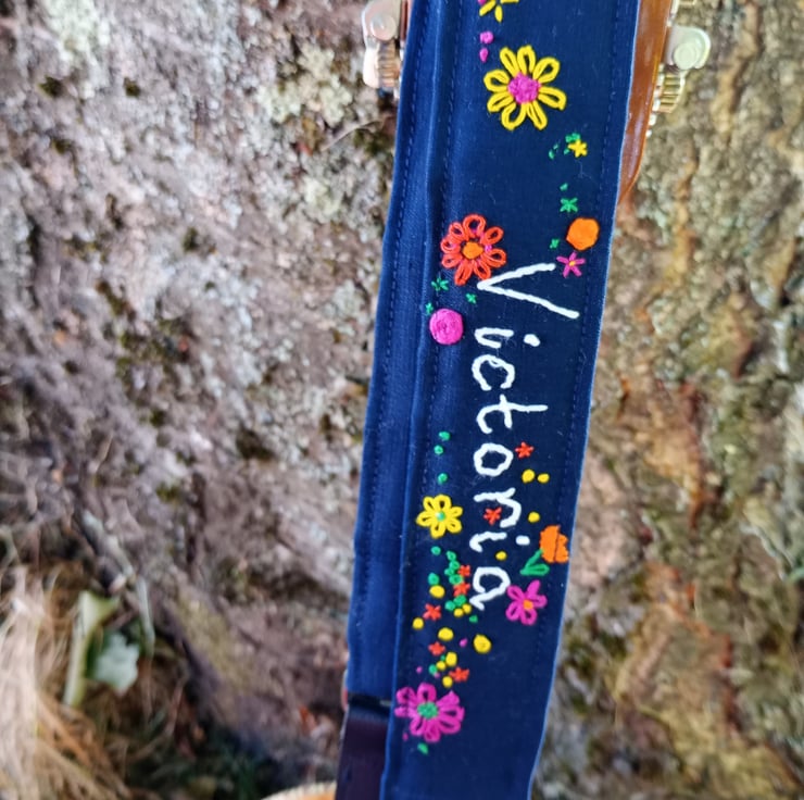The strap pictured is one I made for myself. It is long and adjustable on navy cotton. I have chosen 1.5" (3.8cm) width and a pretty floral design. I have my own name in white in my hand-writing but you could have the name of your uke, your ukulele group, your dog ...