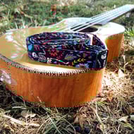 Usually, my straps are hand painted and hand decorated which often makes them 'special occassion' straps to stand out at gigs, clubs and festivals. Ukes don't just go fancy places, though and I felt I wanted to make a range that could go to the park or the beach, sit in the car, come out in the garden ... These straps are still handmade and beautiful but made from a pre-printed cotton so they are more suitable to chuck in the bottom of your gig-bag for everyday use..