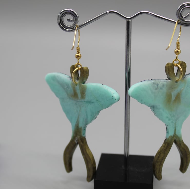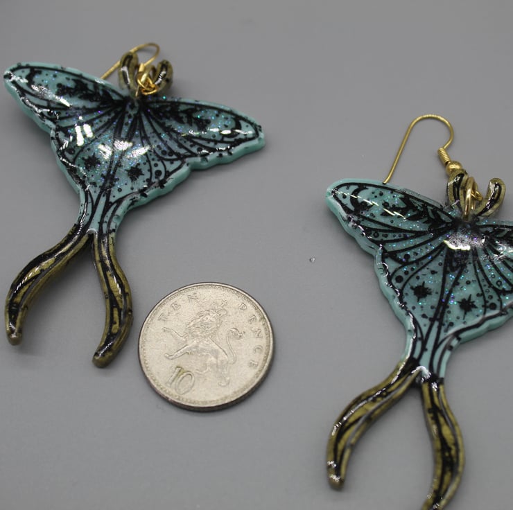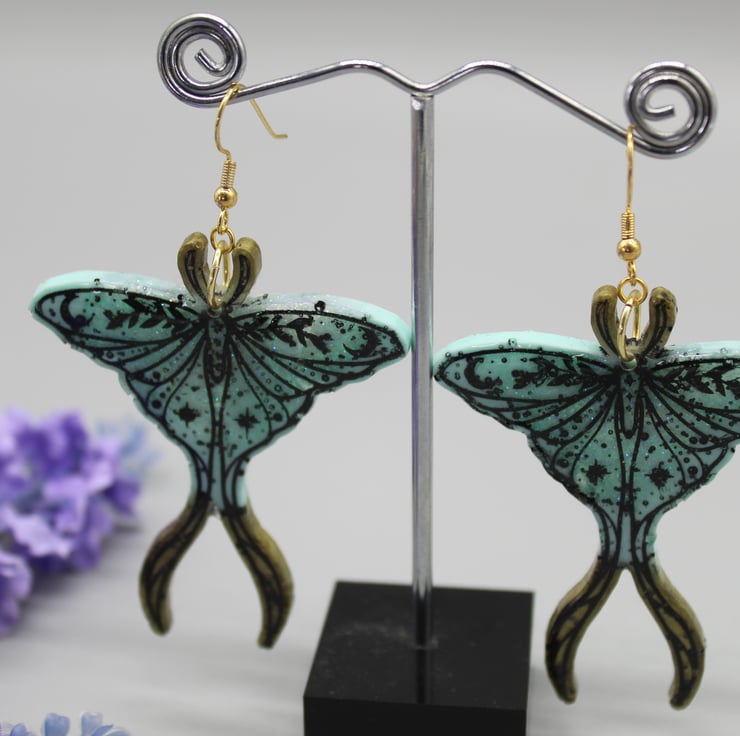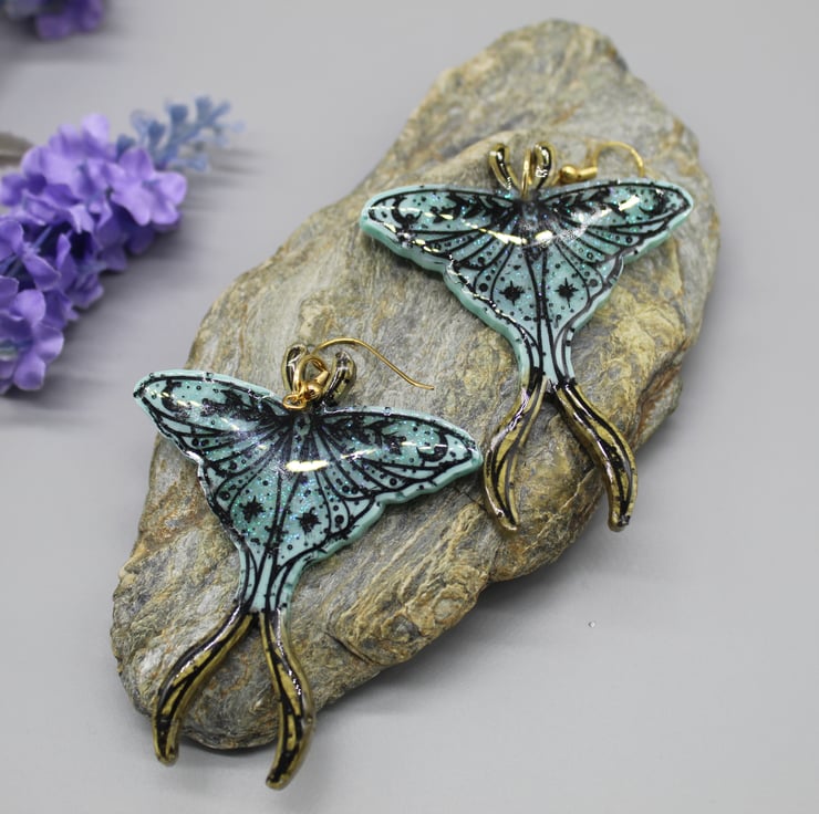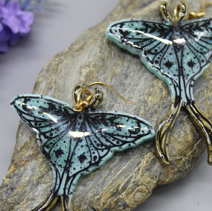These beautiful Luna moth earrings have been made with epoxy resin, coloured in light blue and gold. I have also used some glitter resin in parts of this design for some added sparkle. I have gone over the etched design on these earrings in a black acrylic paint and then put a protective layer of resin over the front.