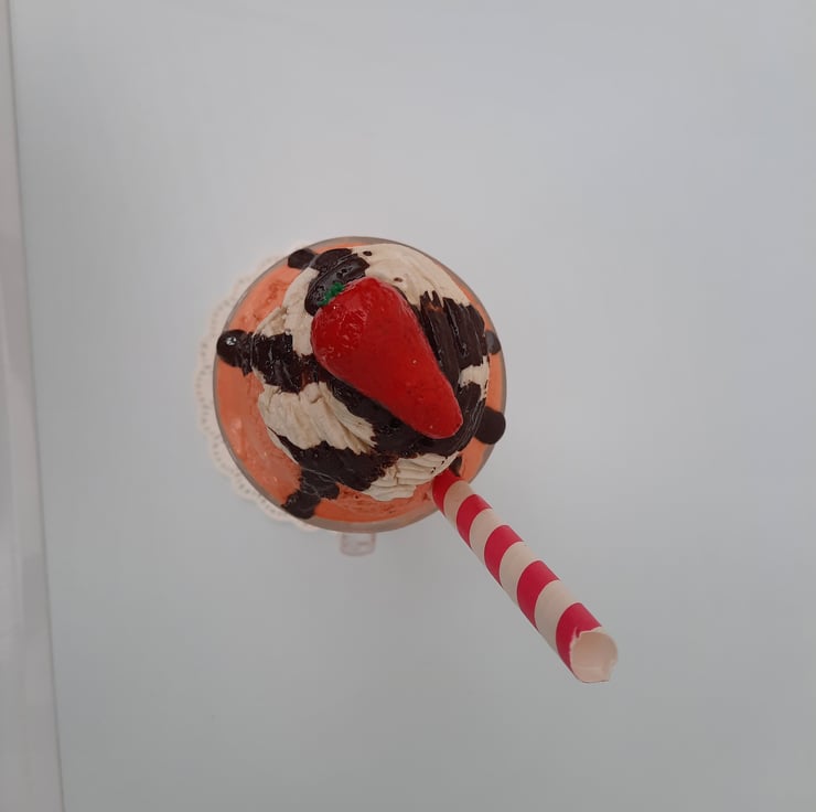 Life size Strawberry Milkshake Ice cream Sundae Fake Dessert Ornament Party Shop Prop Handled glass with strawberry milkshake, scoops of ice cream, cream, chocolate sauce, strawberry on top with straw. Height to top of strawberry is 8"