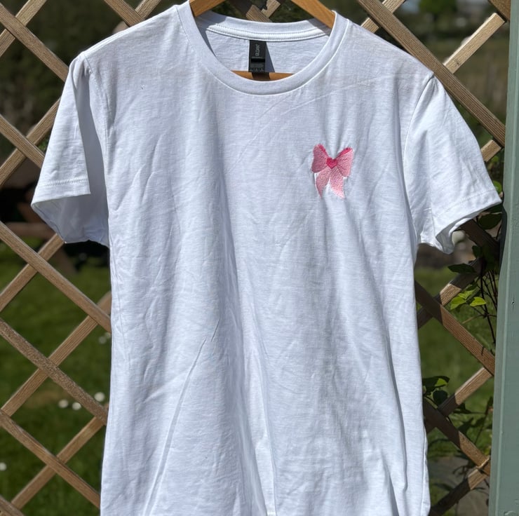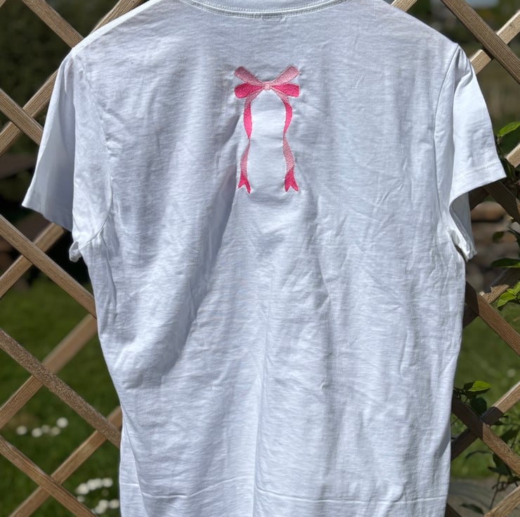 A pink bow embroidered on the left chest, with a heart centre. A longer pink bow is embroidered on the back just under the neckline. A cute girly t-shirt for the summer. If you’d like any changes please get in touch and I’ll do my best to make it.