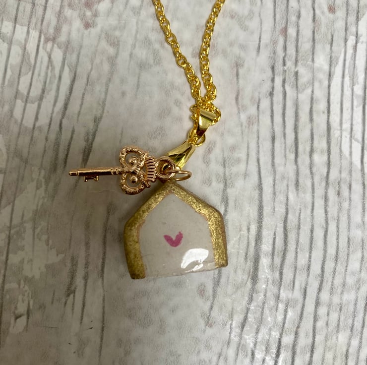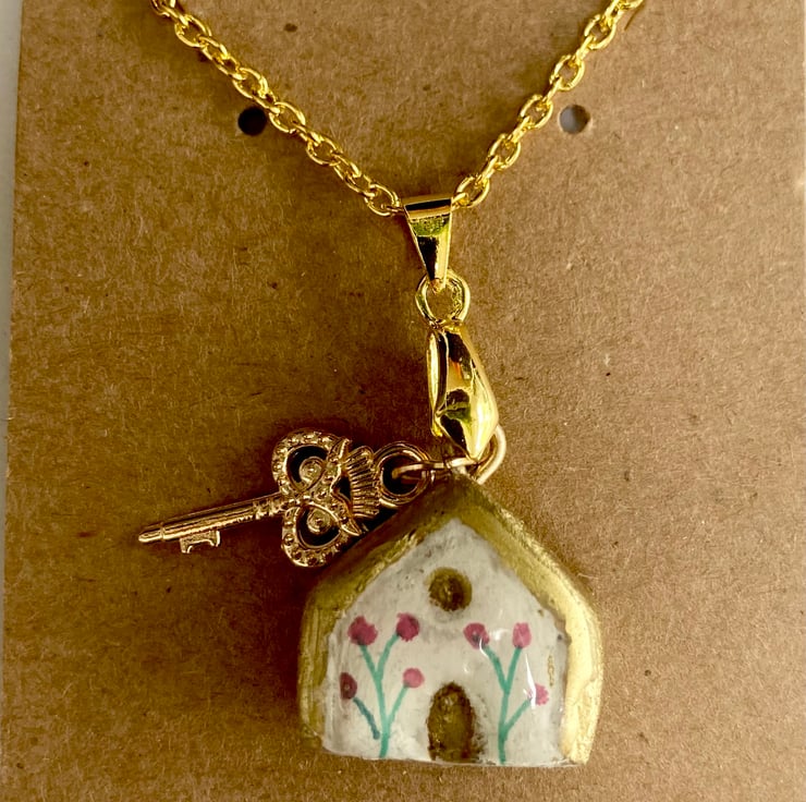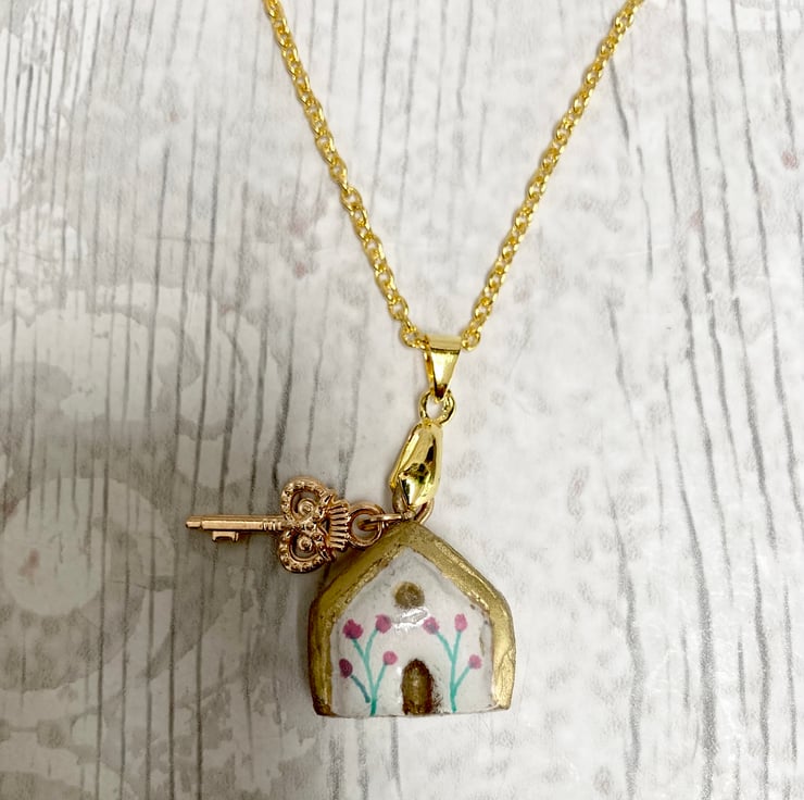 This tiny sweet little house & key charm necklace has been handmade from air dry clay, handpainted with tiny flowers and uv resined for a glossy finish. the back has a little heart painted in the centre. The edges are painted in gold.