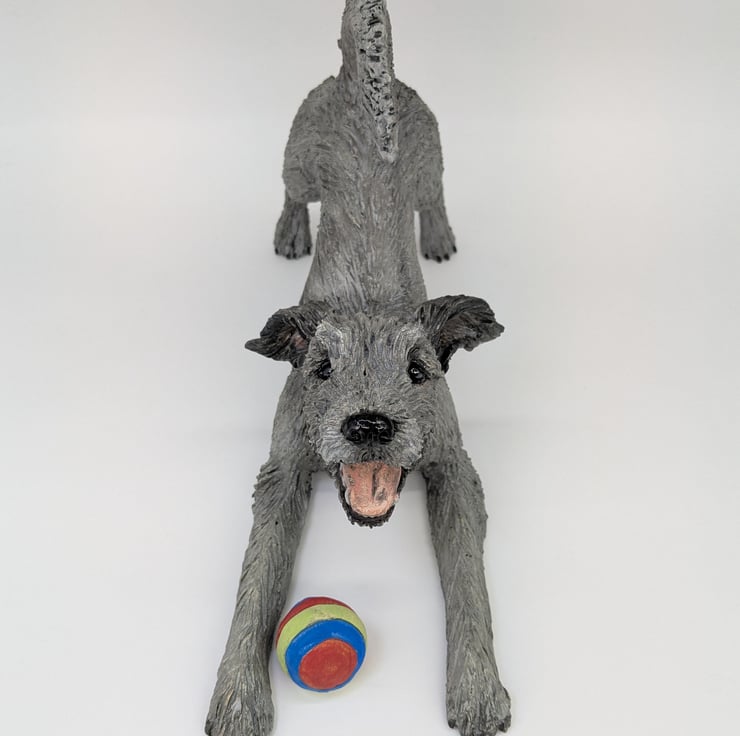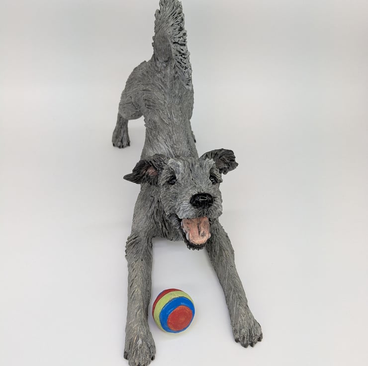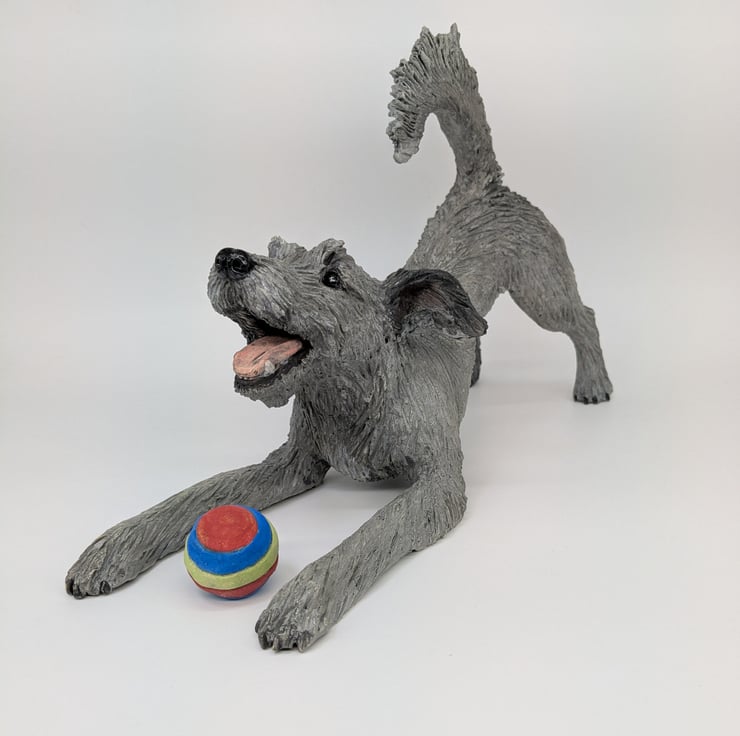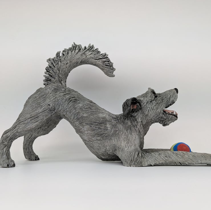 Hand built in stoneware clay, this lurcher is captured in a play bow pose inspired by my own scruffy mutt!