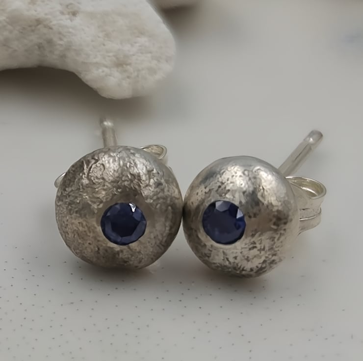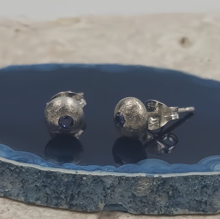 Molten Sterling Silver Stud Earrings with Blue Cubic Zirconia