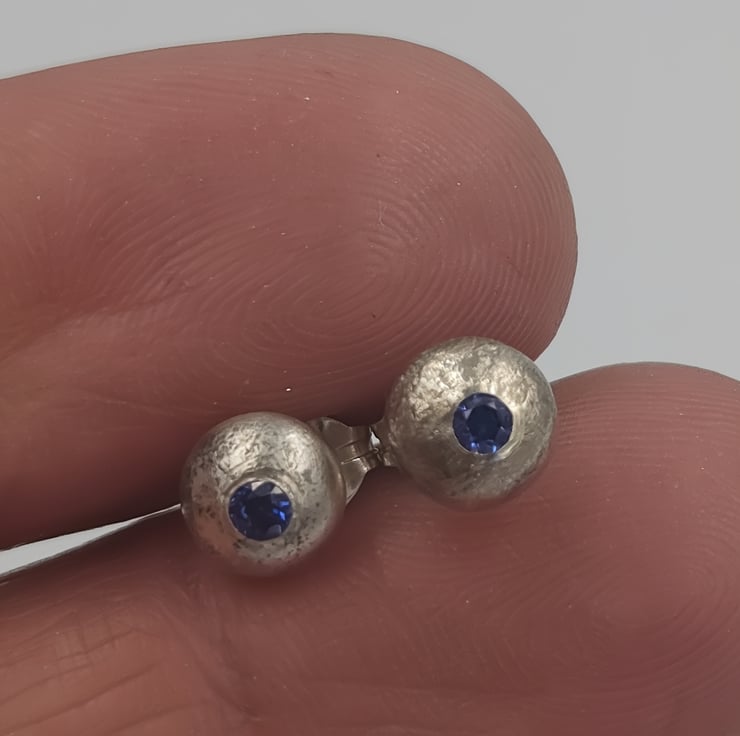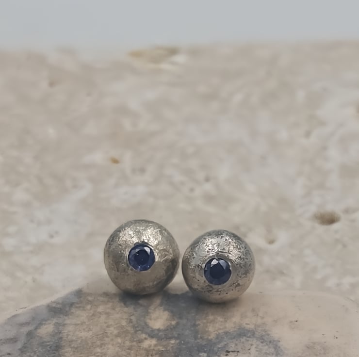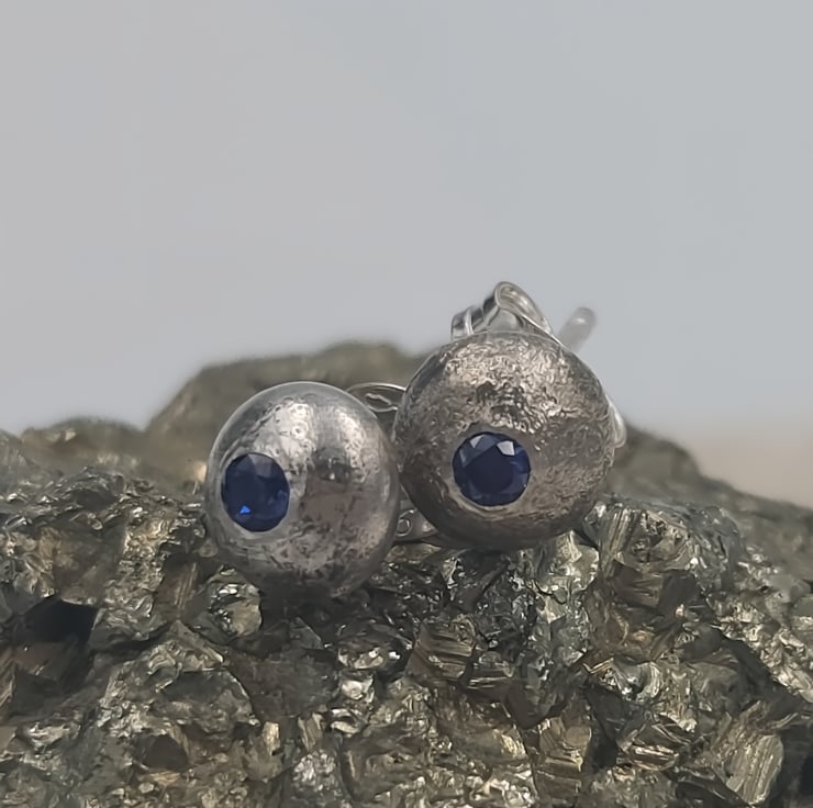 These molten sterling silver stud earrings are individually handcrafted, with freeform organic shapes created by flowing molten silver. At the centre of each earring glows a 2mm blue cubic zirconia, offering a subtle pop of tranquil, ocean-inspired sparkle.