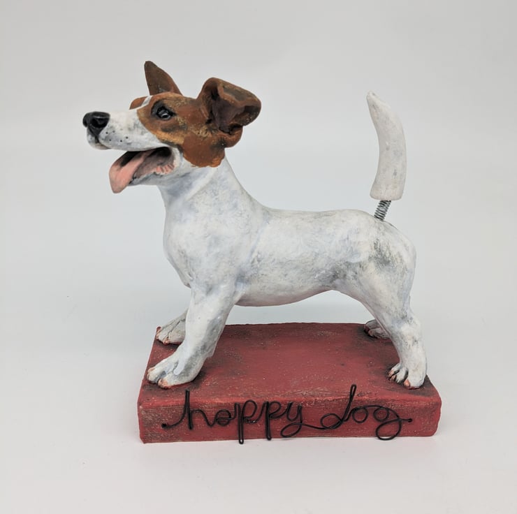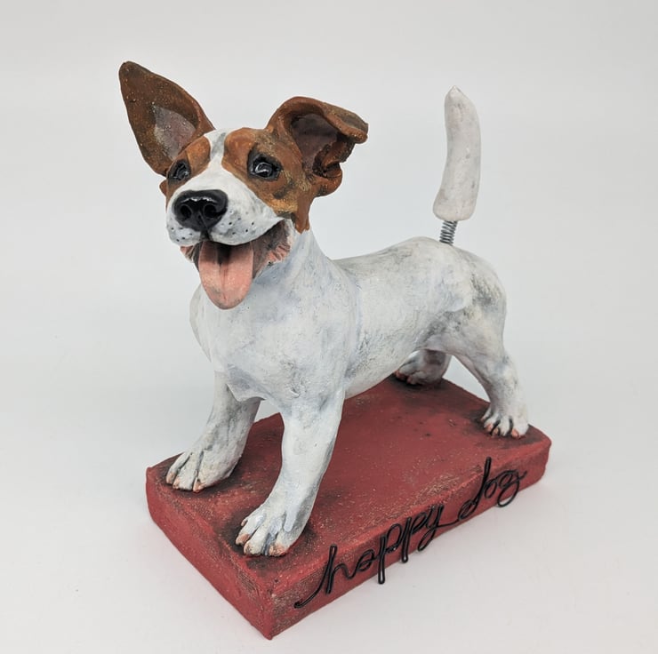 Handmade in 2022 in clay with wire sprung tail and lettering, this fun sculpture was made as part of a group based on a board book my children used to love called “Happy Dog, Sad Dog”.