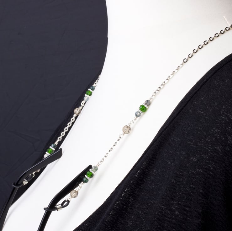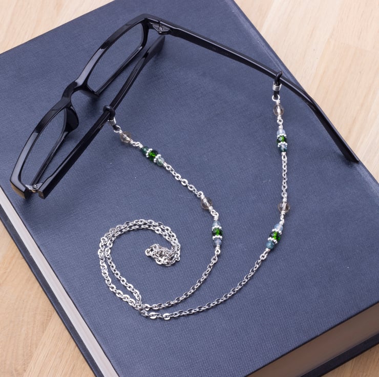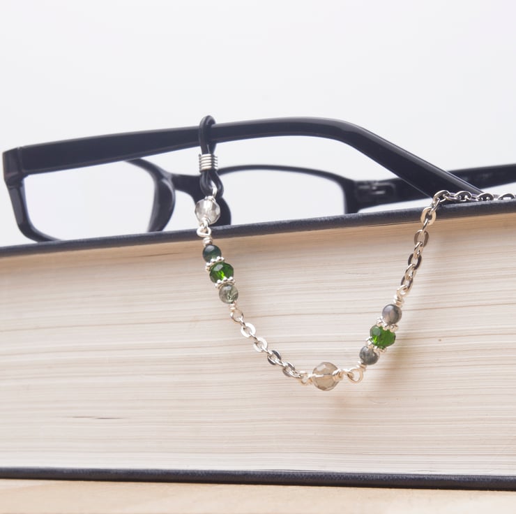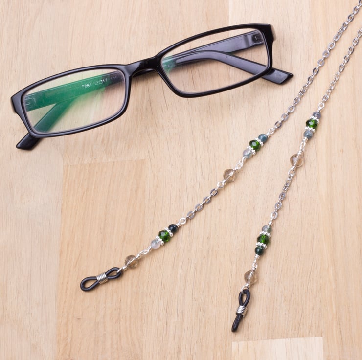 This beautiful glasses chain features small green moss agate gemstones, complemented by green and grey faceted glass beads and Tibetan silver accent beads. The gemstones are wire wrapped and linked into a silver-tone oval link chain, finished with spectacle ends to securely hold your glasses. The chain is approximately 26 inches long.