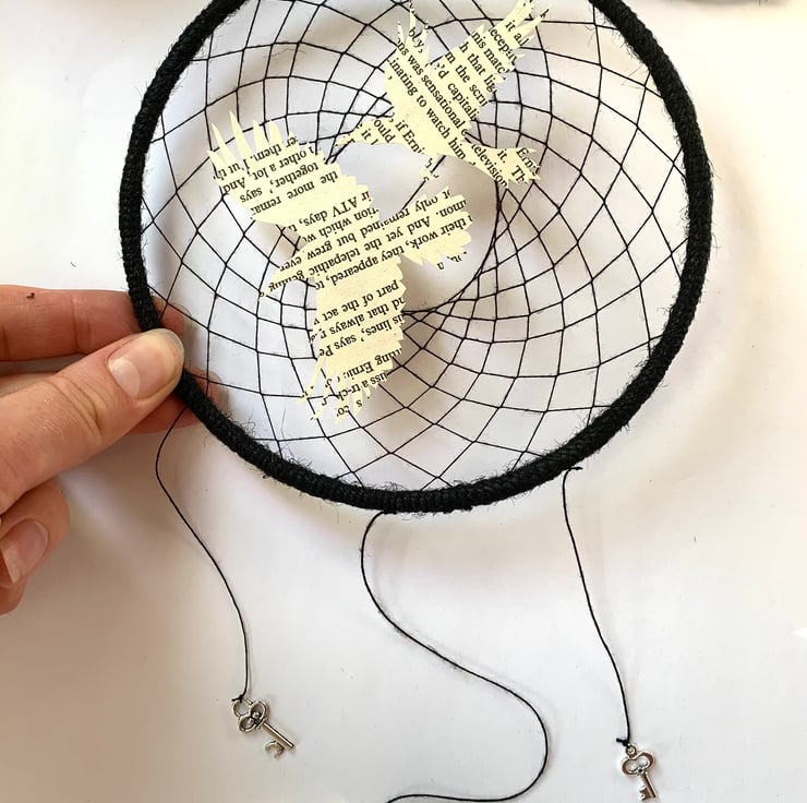 My storybook animal dreamcatchers are inspired by the stories I tell myself when I walk in the forest near my home. I created these unusual, quirky ink drawing dreamcatcher decorations because I wanted to decorate my bedroom with my stories, words and poetry. I make these animals from recycled vintage book pages. I hand cut each shape and paint on the details in ink.