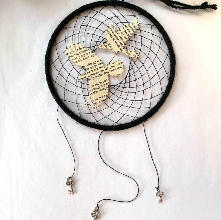Unique handmade raven spirit dreamcatcher with two white flying ravens hand cut from recycled vintage book pages