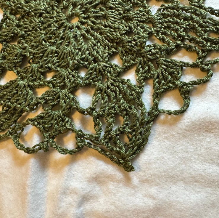 It is made in a light weight, strong cotton yarn with a slight sheen in a gorgeous olive green.