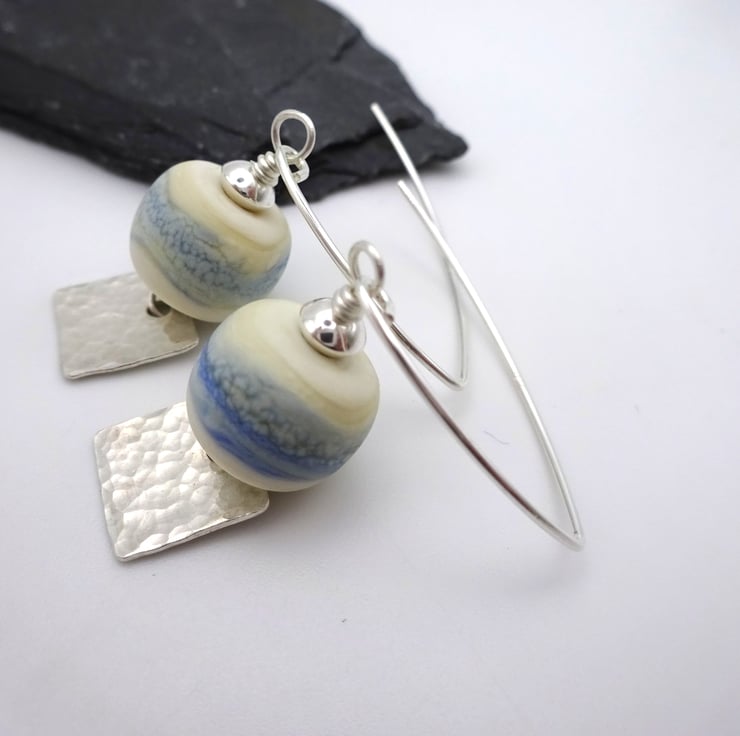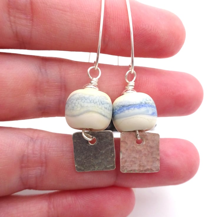 A pair of sterling silver earrings made with ivory and blue lampwork glass beads. The earring have small hand hammered sterling silver charms.