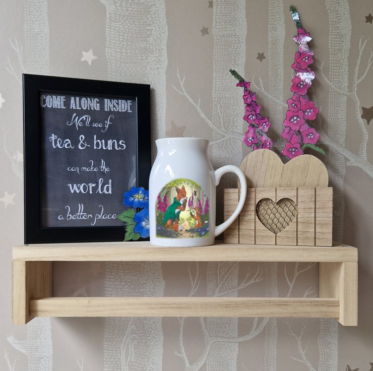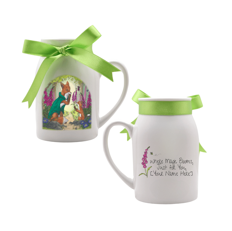 This white ceramic jug features my original ink & watercolour illustration of Finn Willowbrush, the fox cub who once mistook foxgloves for tiny gloves—and stumbled into a much-loved tale of folklore and faerie logic.