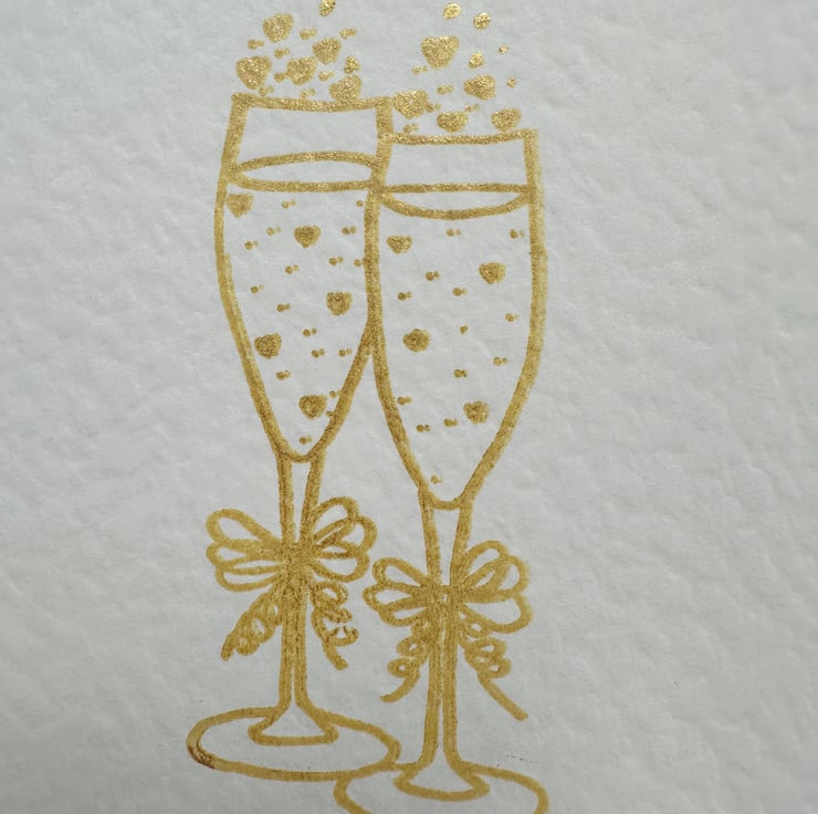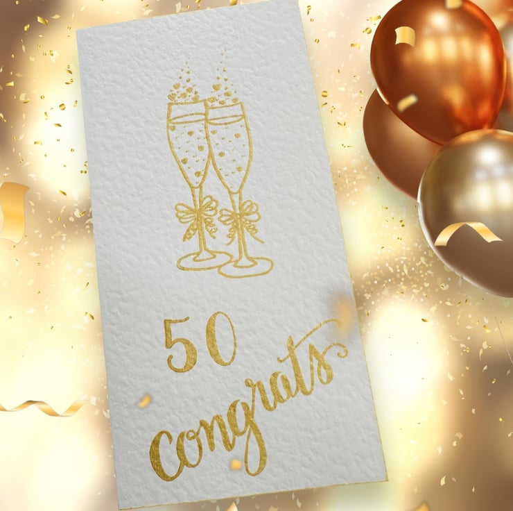 Featuring two glasses of champagne with bows and fizzy bubbles and hearts in a metallic shiny gold. The message of “50” and “congrats” sit below.