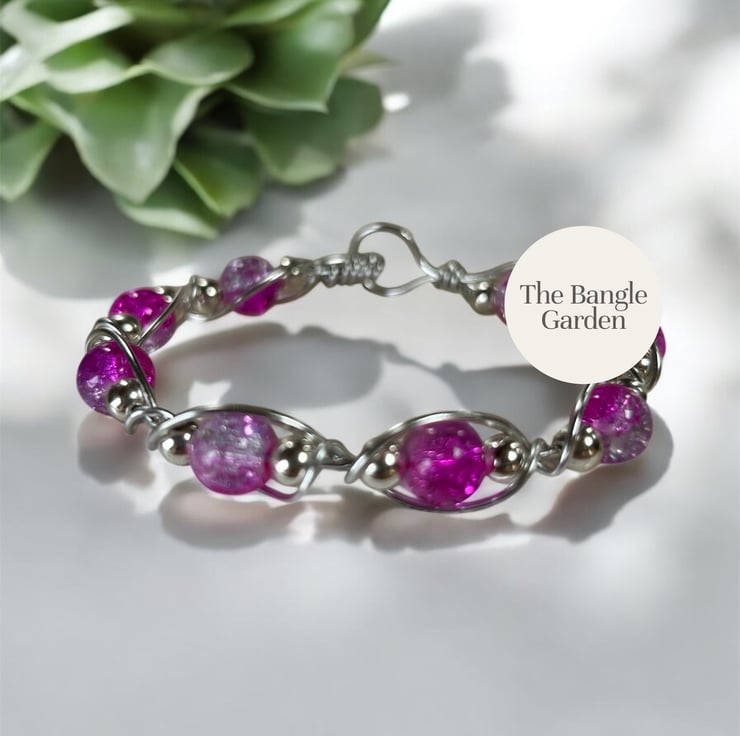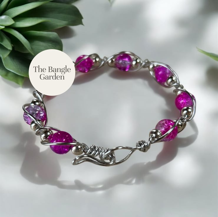 Handmade wire wrapped bangle with vibrant pink variegated and silver beads