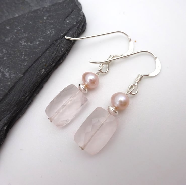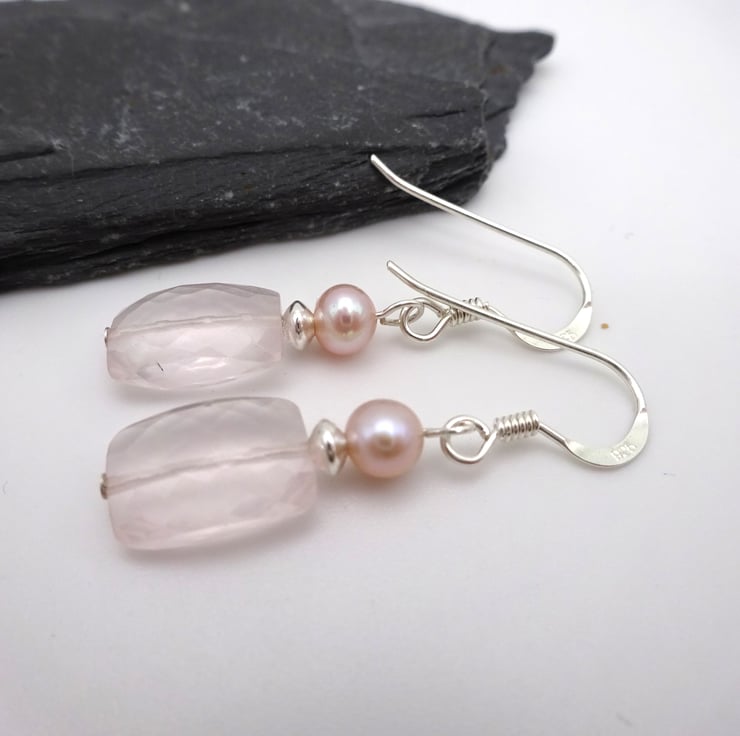 A pair of sterling silver earrings which feature freshwater pearl and rose quartz gemstone beads.