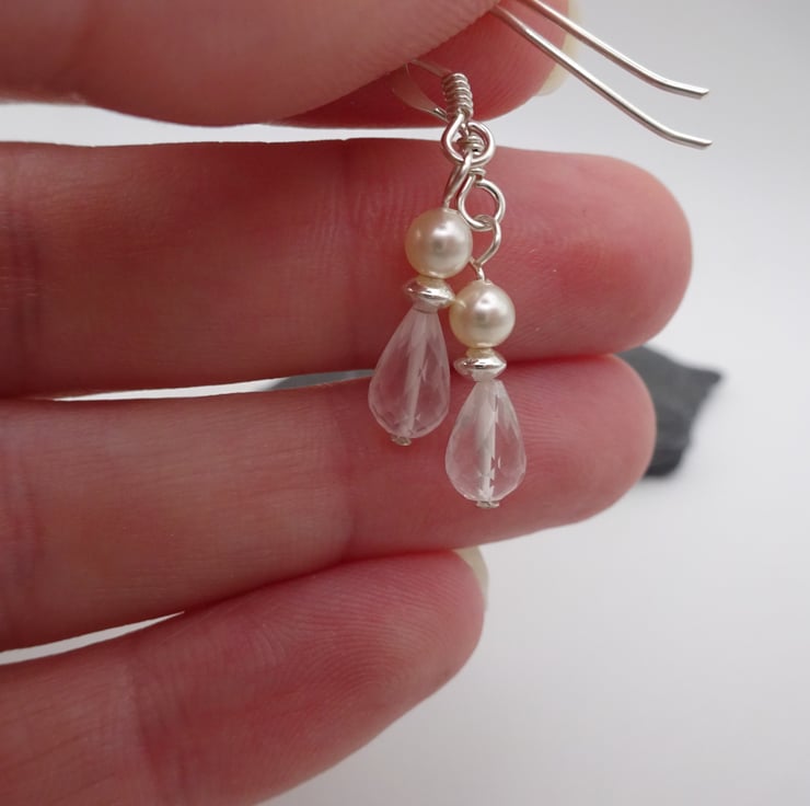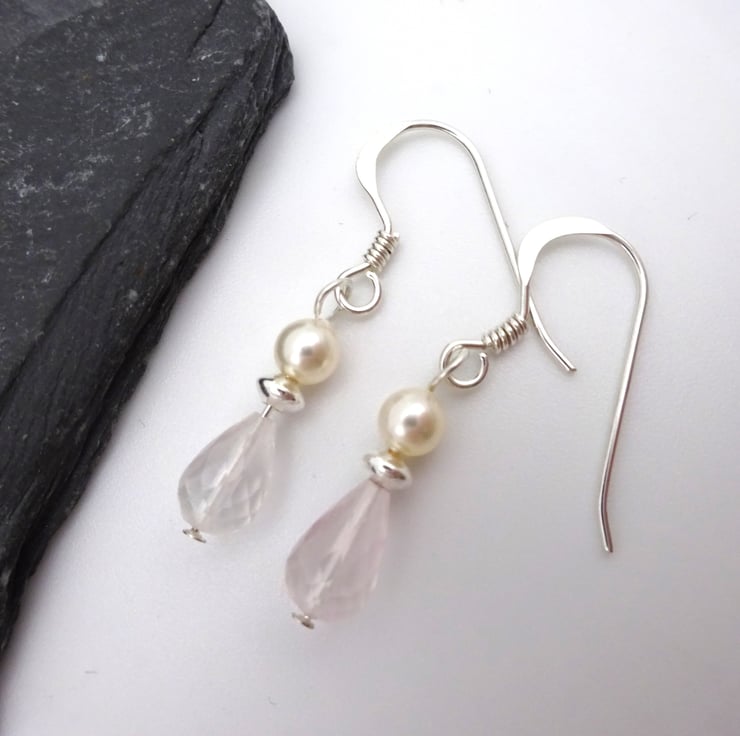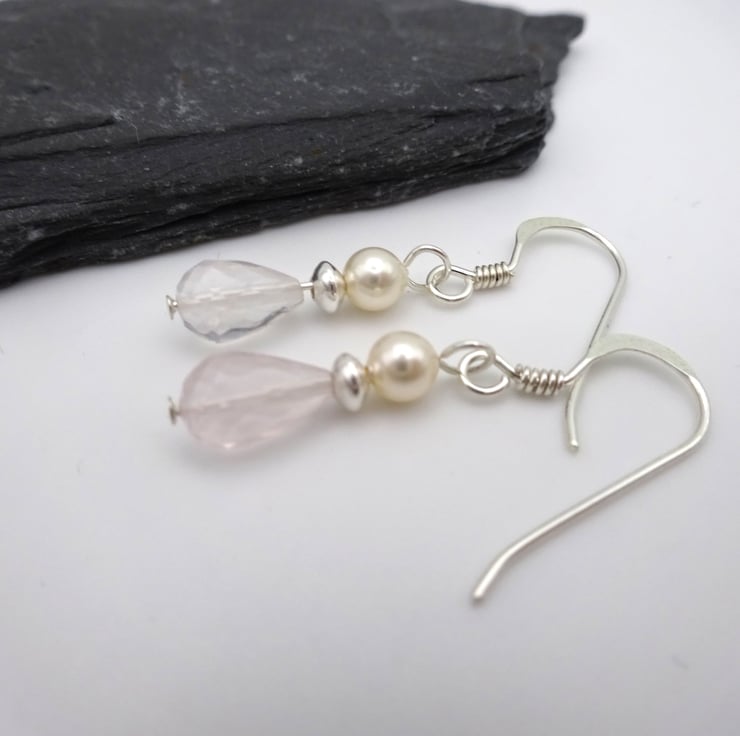 A pair of sterling silver earrings which feature freshwater pearl beads and Rose Quartz gemstone teardrop beads.